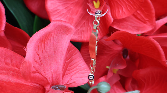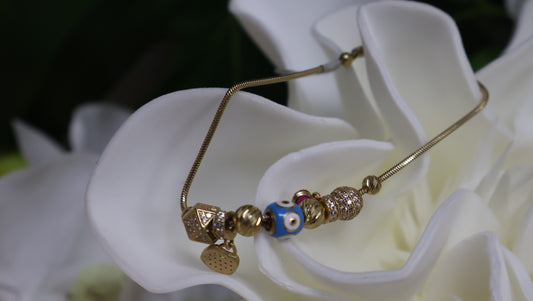 Manilla de nino con placa de ojitos en azul en oro de 14k