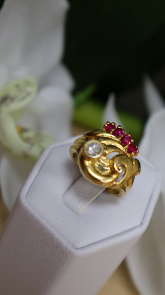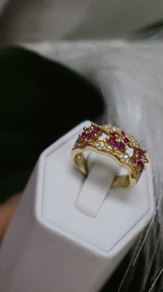 anillo de mujer 14k con dos flores y dos piedra roja