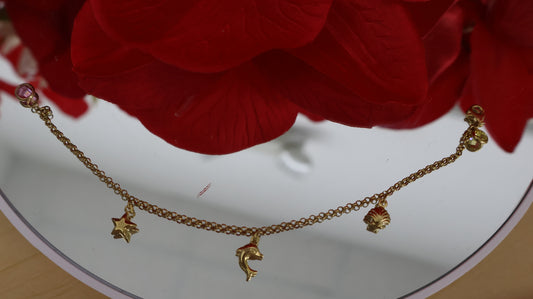 Manilla para ninas con colgantes de un delfin , una concha ,una estrellita y dos piedrita en oro de 10k