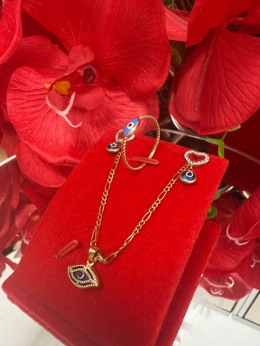 Conjunto de arete ,anillo ,cadena y dije de ojitos en azul
