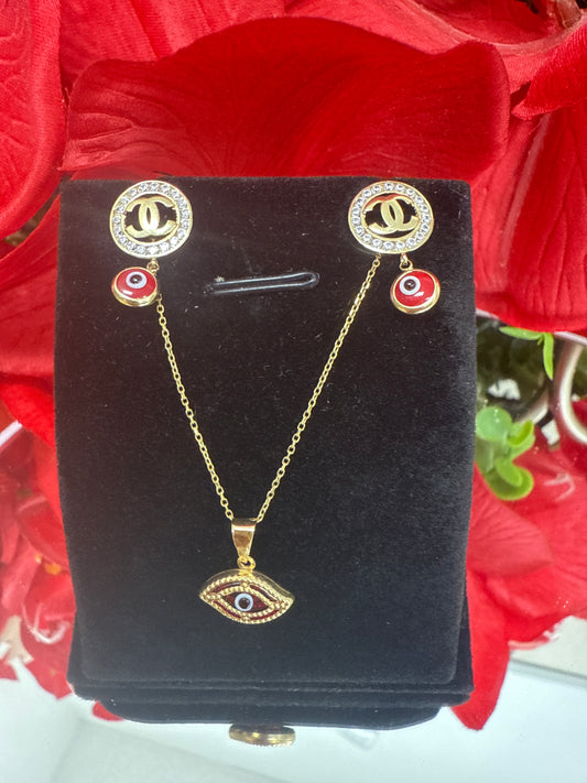Conjunto de cadena , dije y aretes CC de ojitos en rojo para ninas y mujer