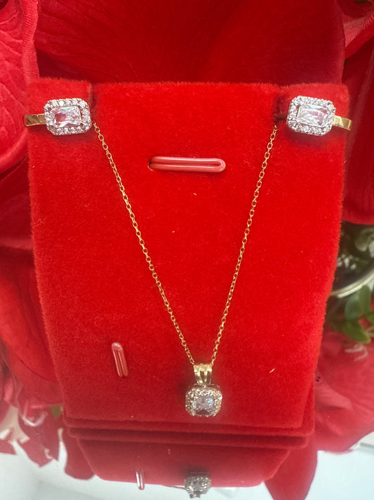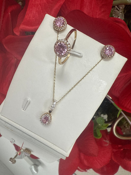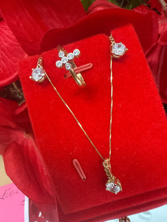 Disfruta de este bello conjunto de arete ,cadena ,dije y anillo con sirconia en rosada de oro 10k