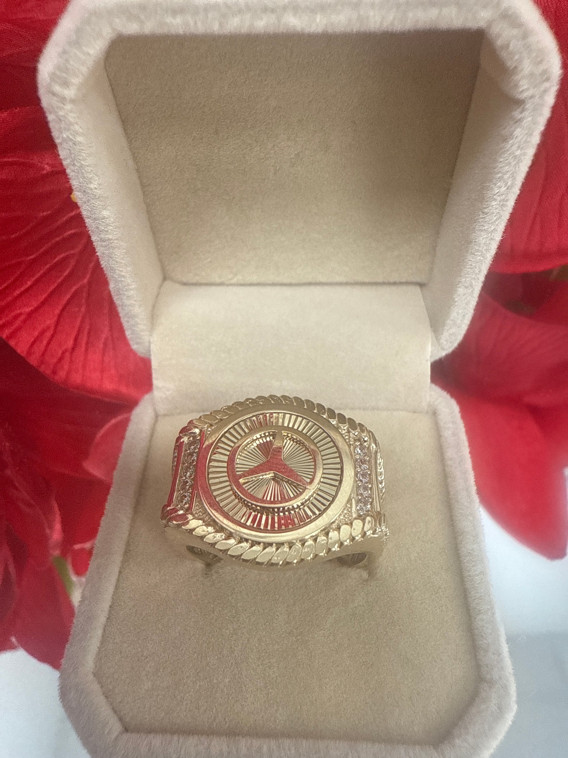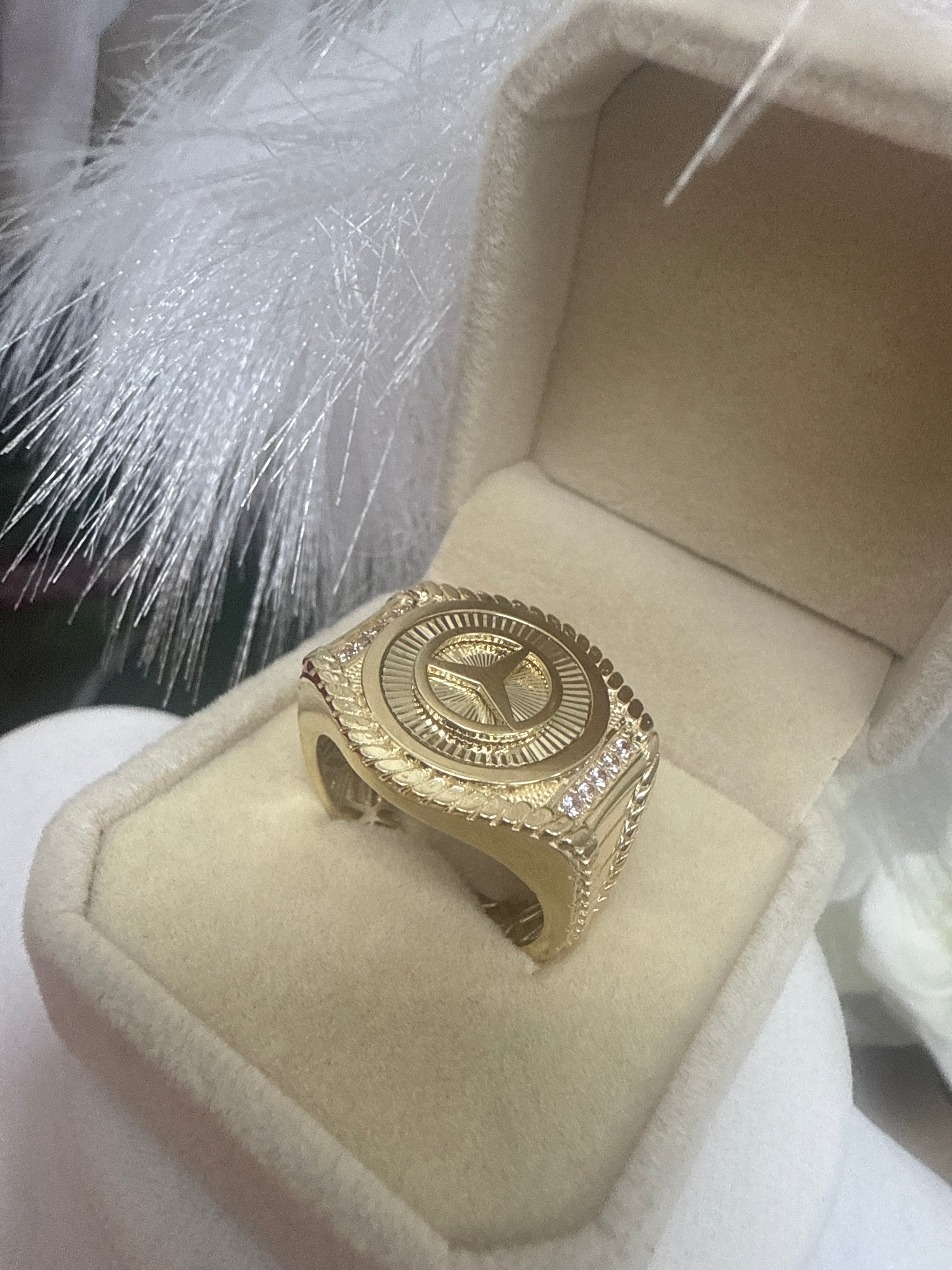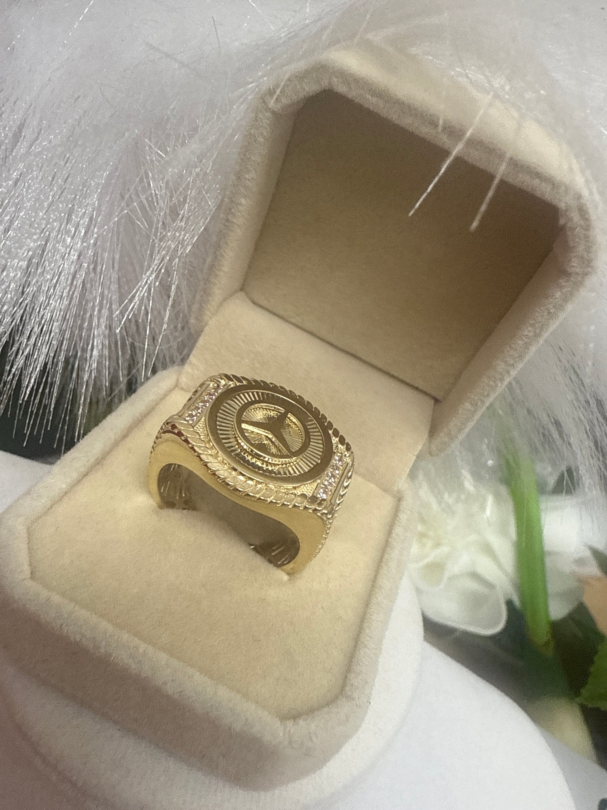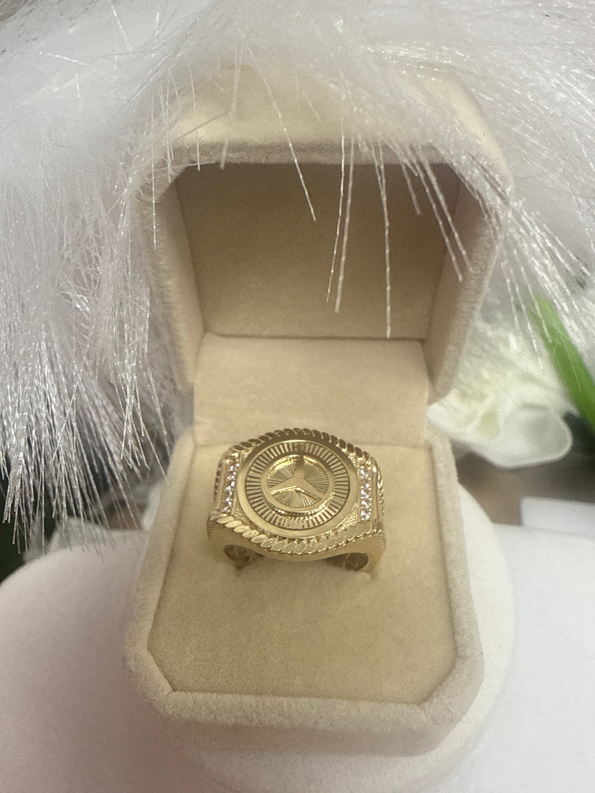 Anillo de hombre de oro 10k con un diseno de la marca mercedes benz .