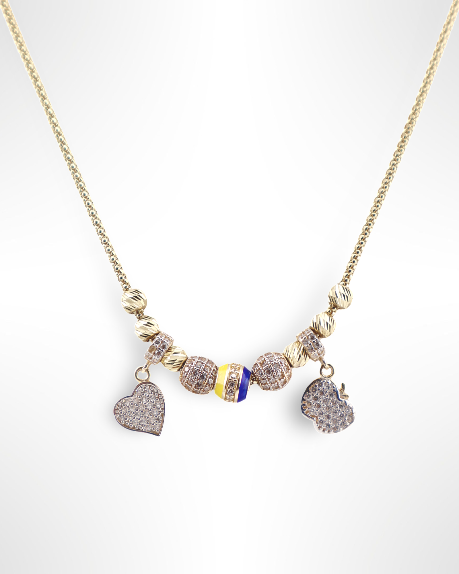 ¡Agrega un toque dulce y único a tu atuendo con nuestra cadena de oro 14k con dos dijes de corazón y manzana!