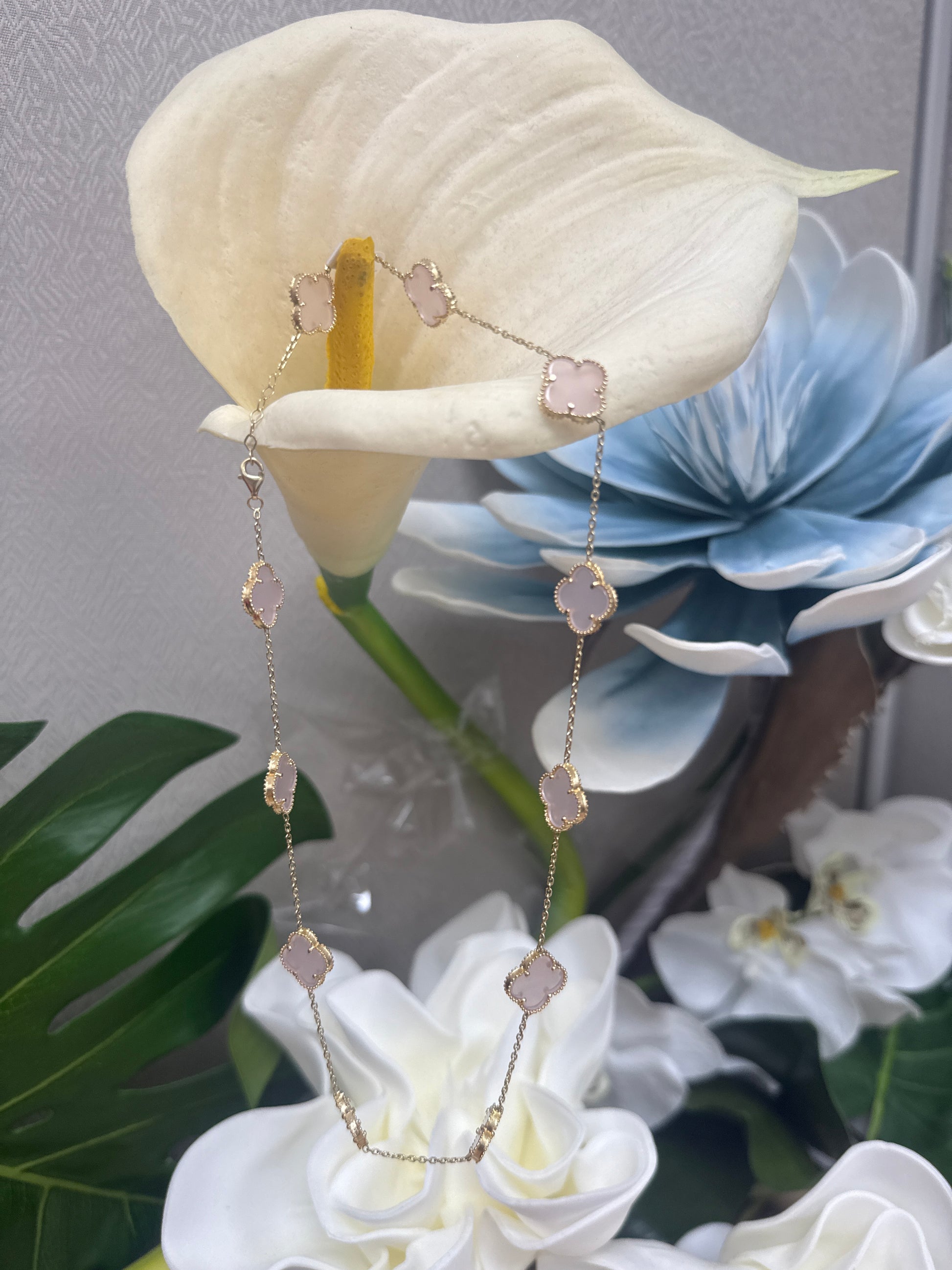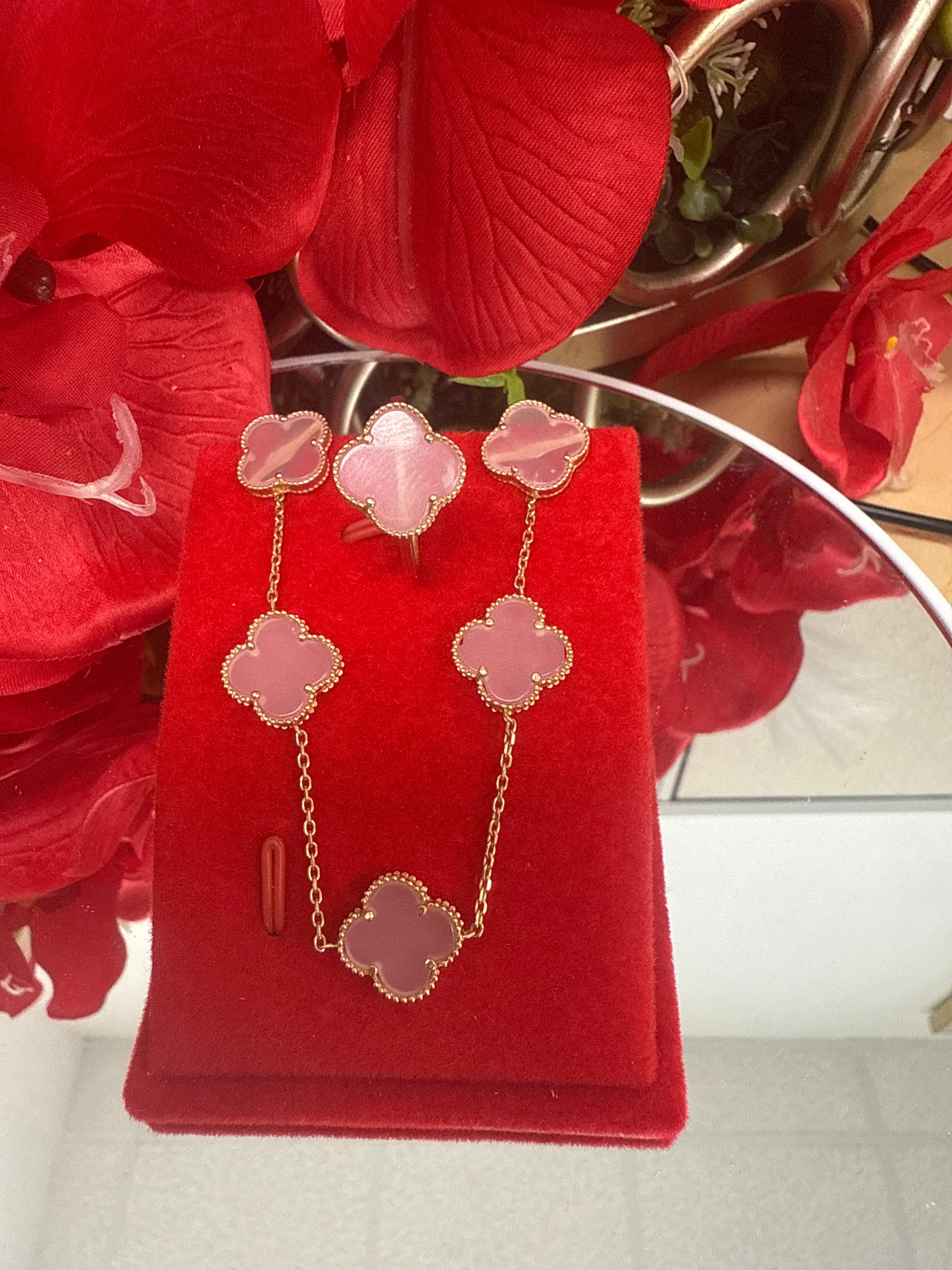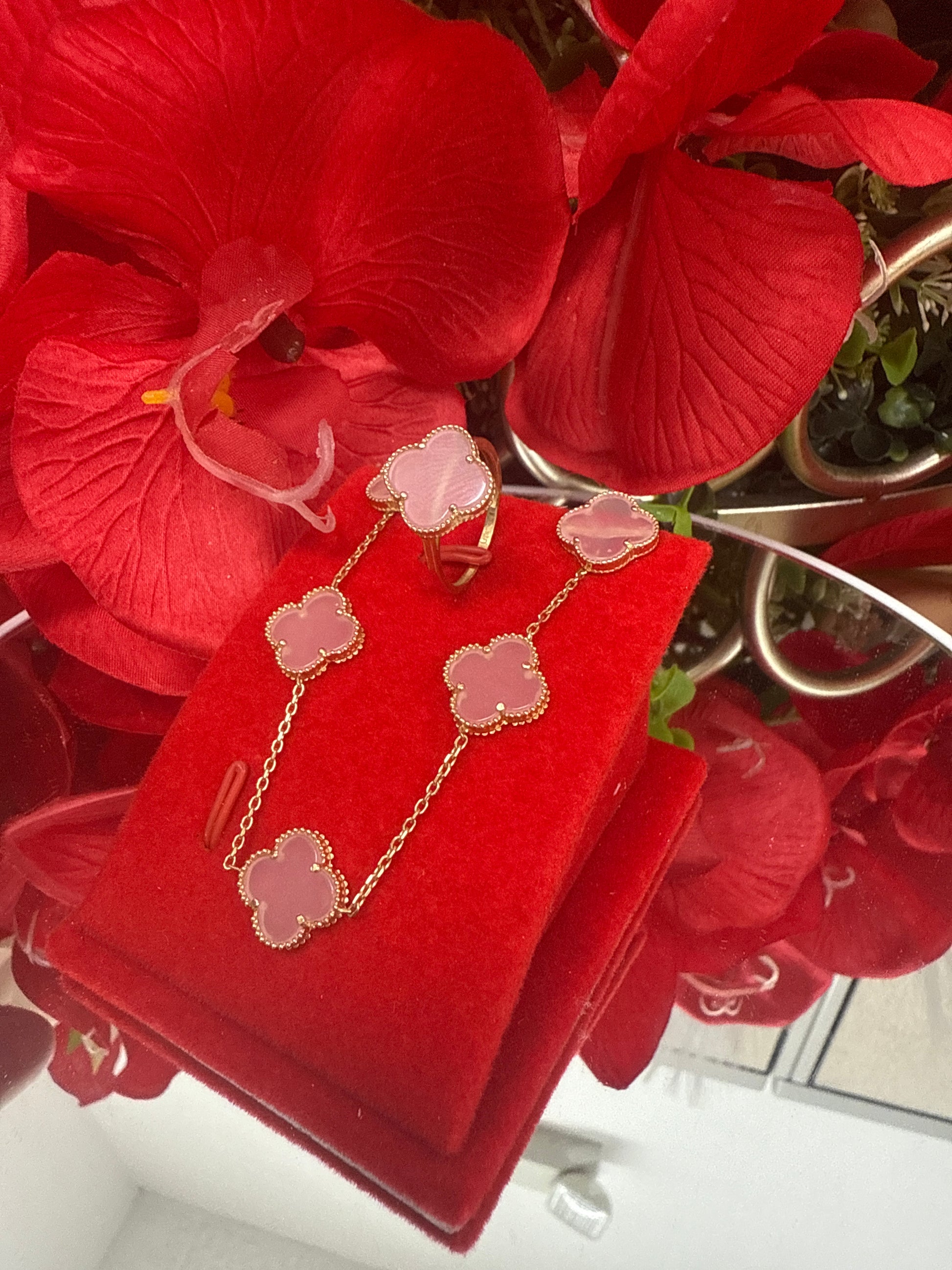 conjunto de arete ,anillo y cadena de mujer de clover en rosada