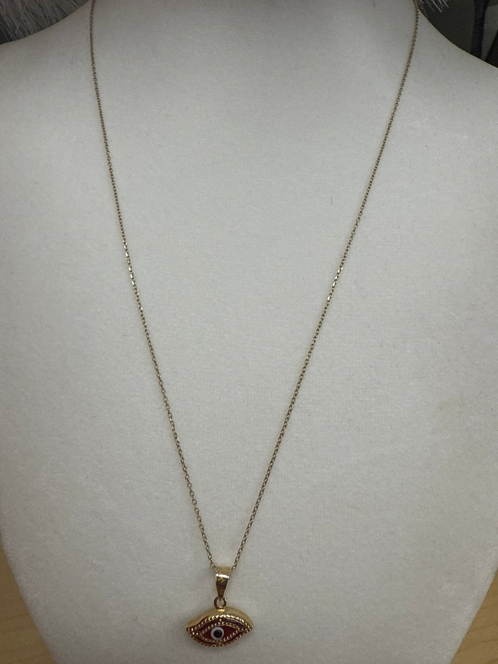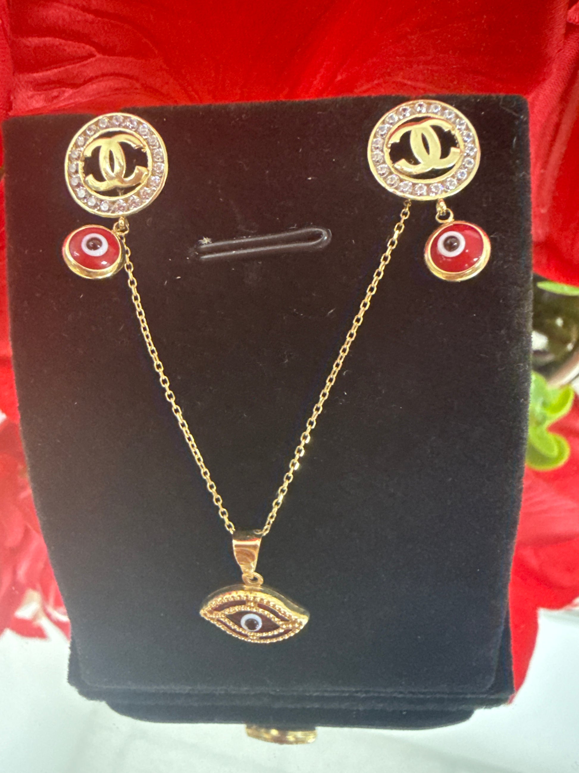 Conjunto de cadena , dije y aretes CC de ojitos en rojo para ninas y mujer