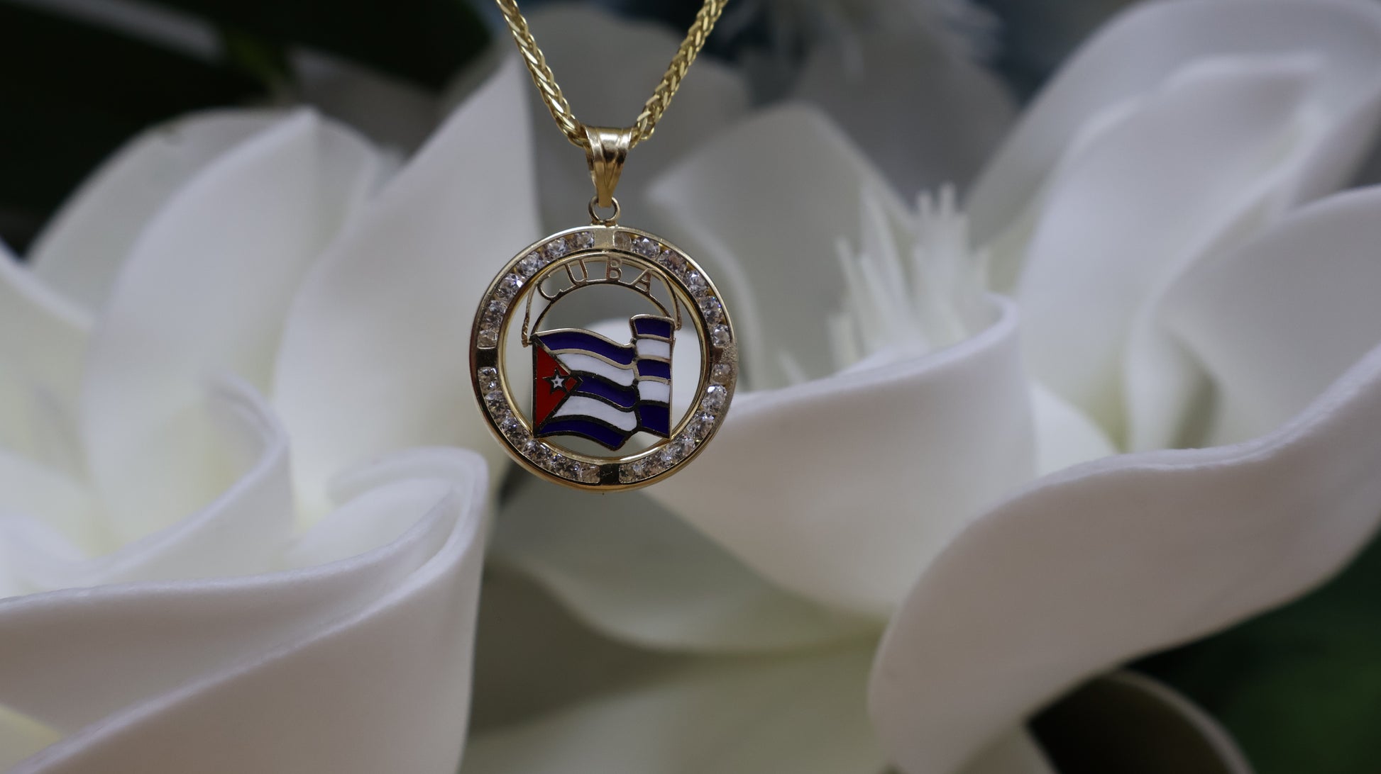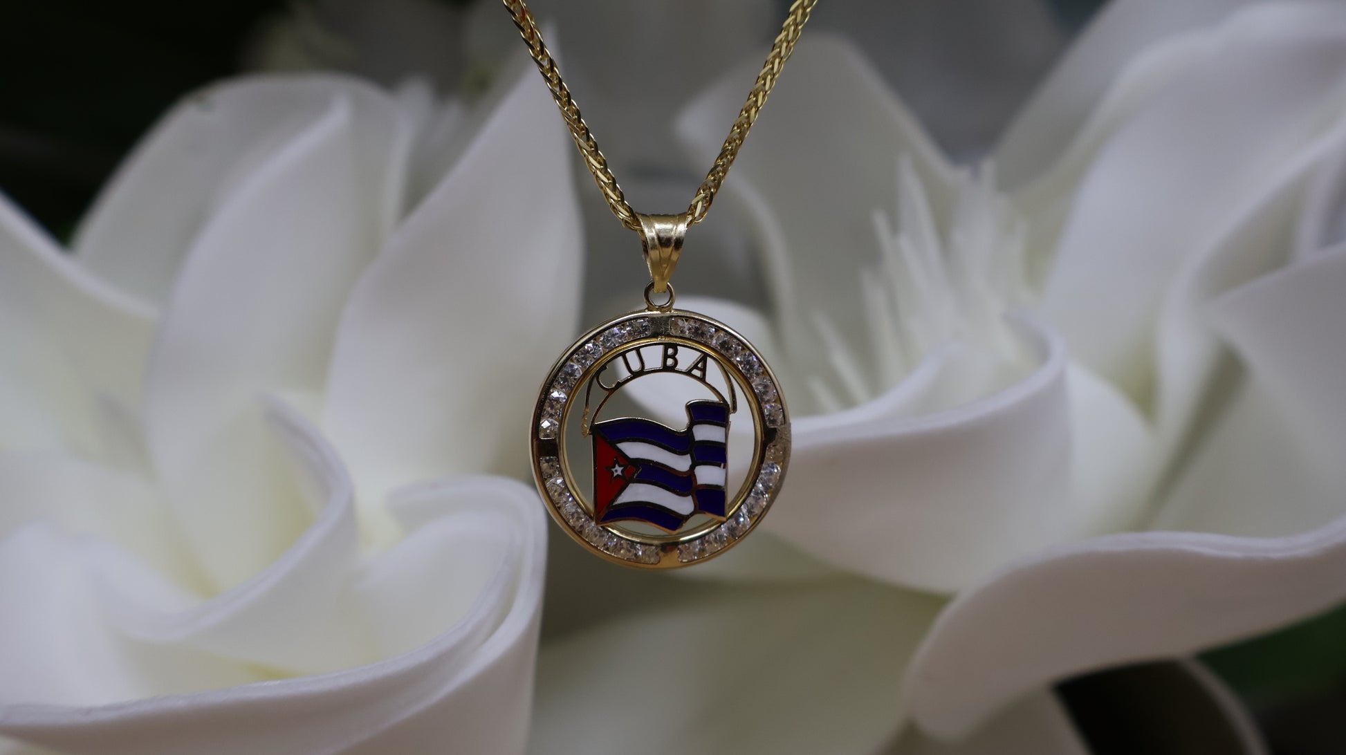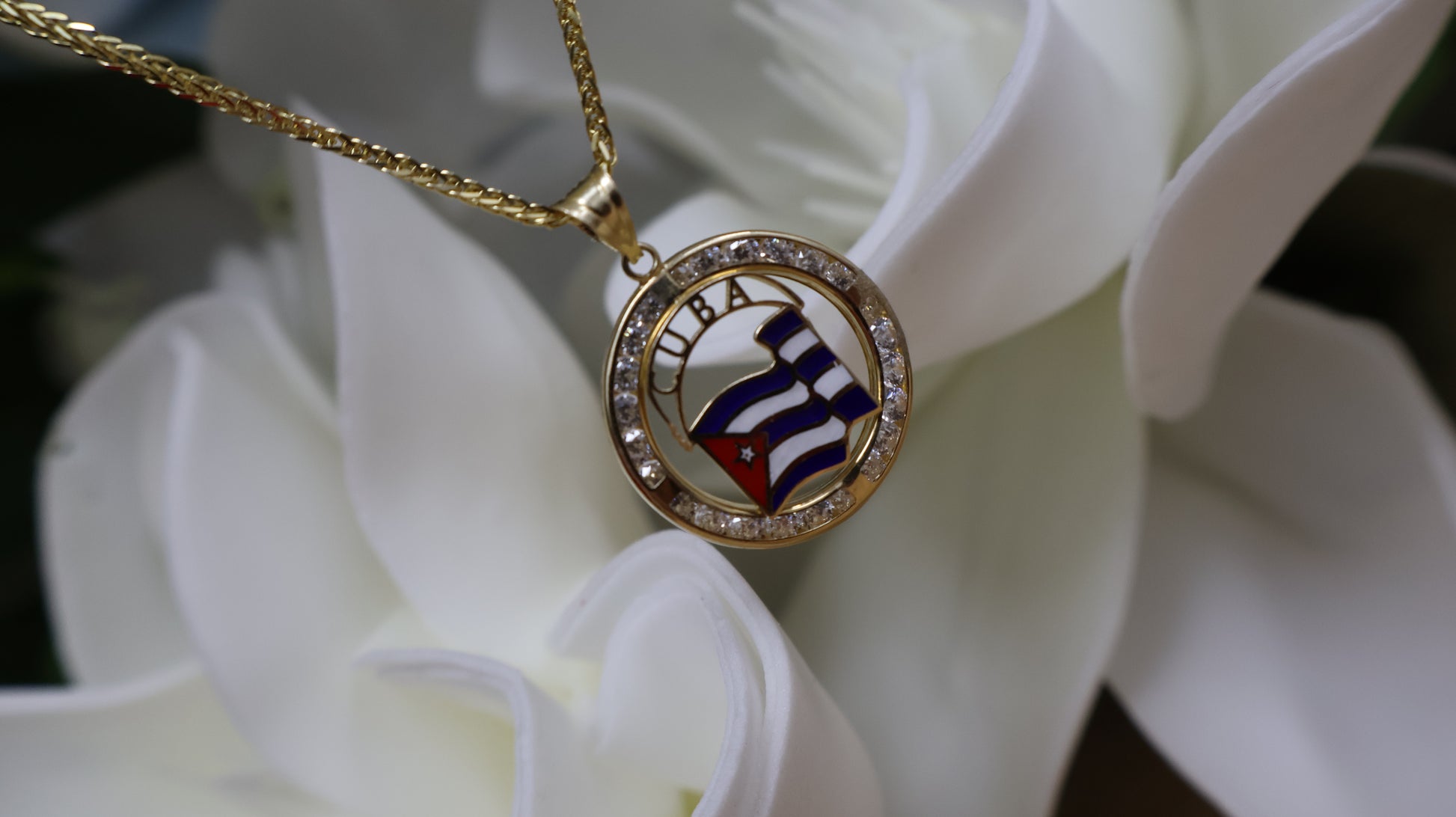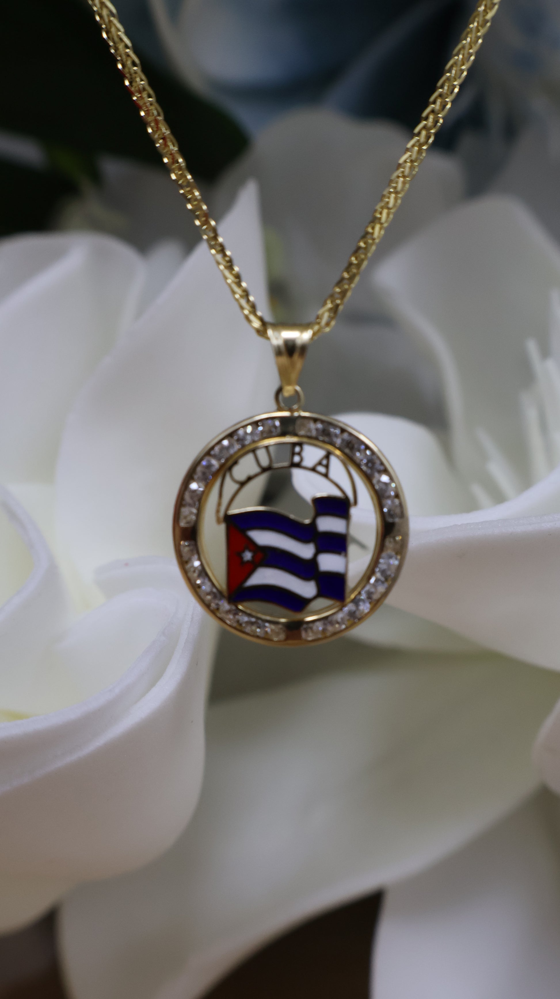Este dije redondo de 14k con la bandera cubana es una pieza vibrante y llena de orgullo. Su diseño detallado y acabado en oro brillante lo convierten en un accesorio perfecto para quienes desean llevar consigo un símbolo de identidad y raíces con estilo y elegancia.