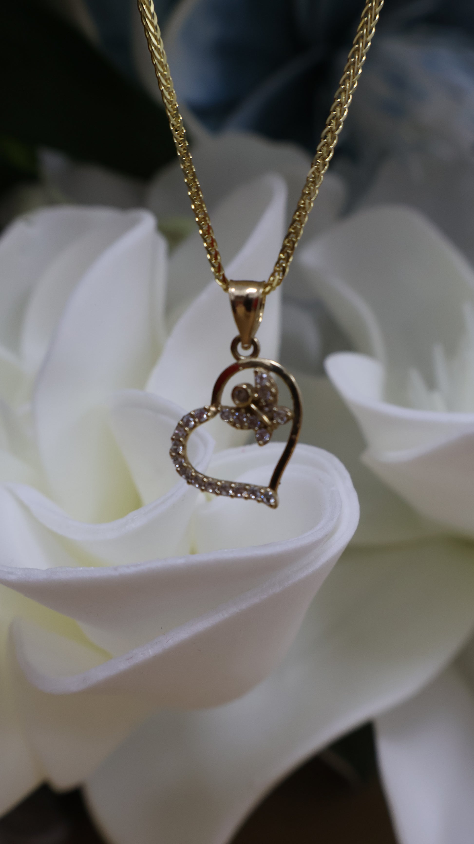 Este dije de corazón en oro 10k, adornado con una mariposa y circonia blanca, combina delicadeza y brillo en una pieza única. Su diseño simboliza transformación y amor, aportando un toque elegante y significativo que realza cualquier estilo con sofisticación.