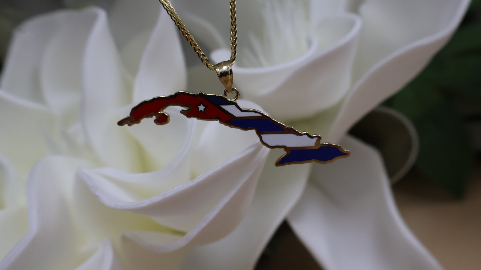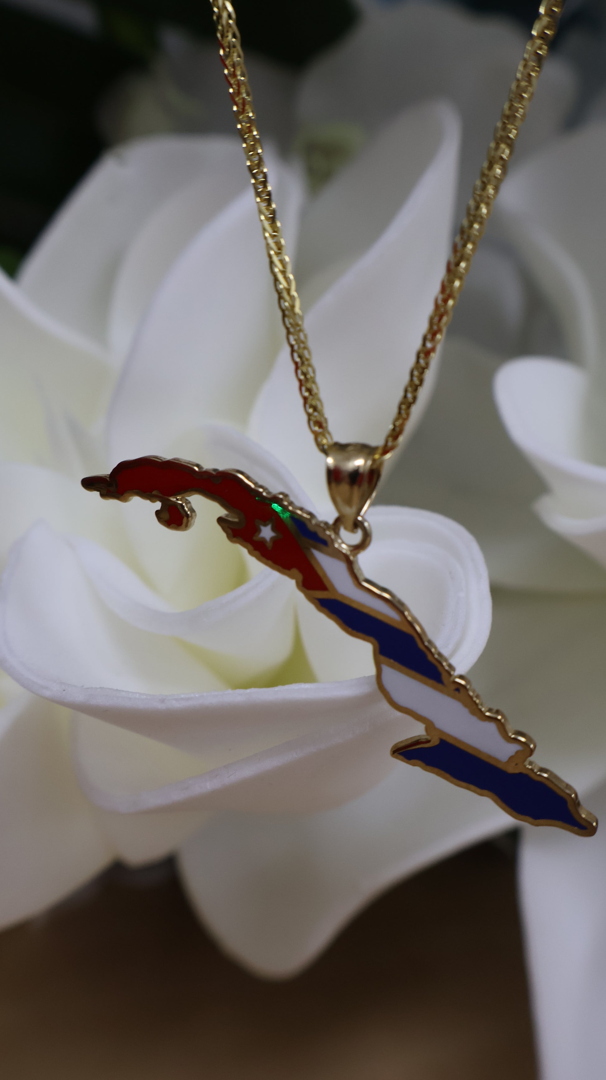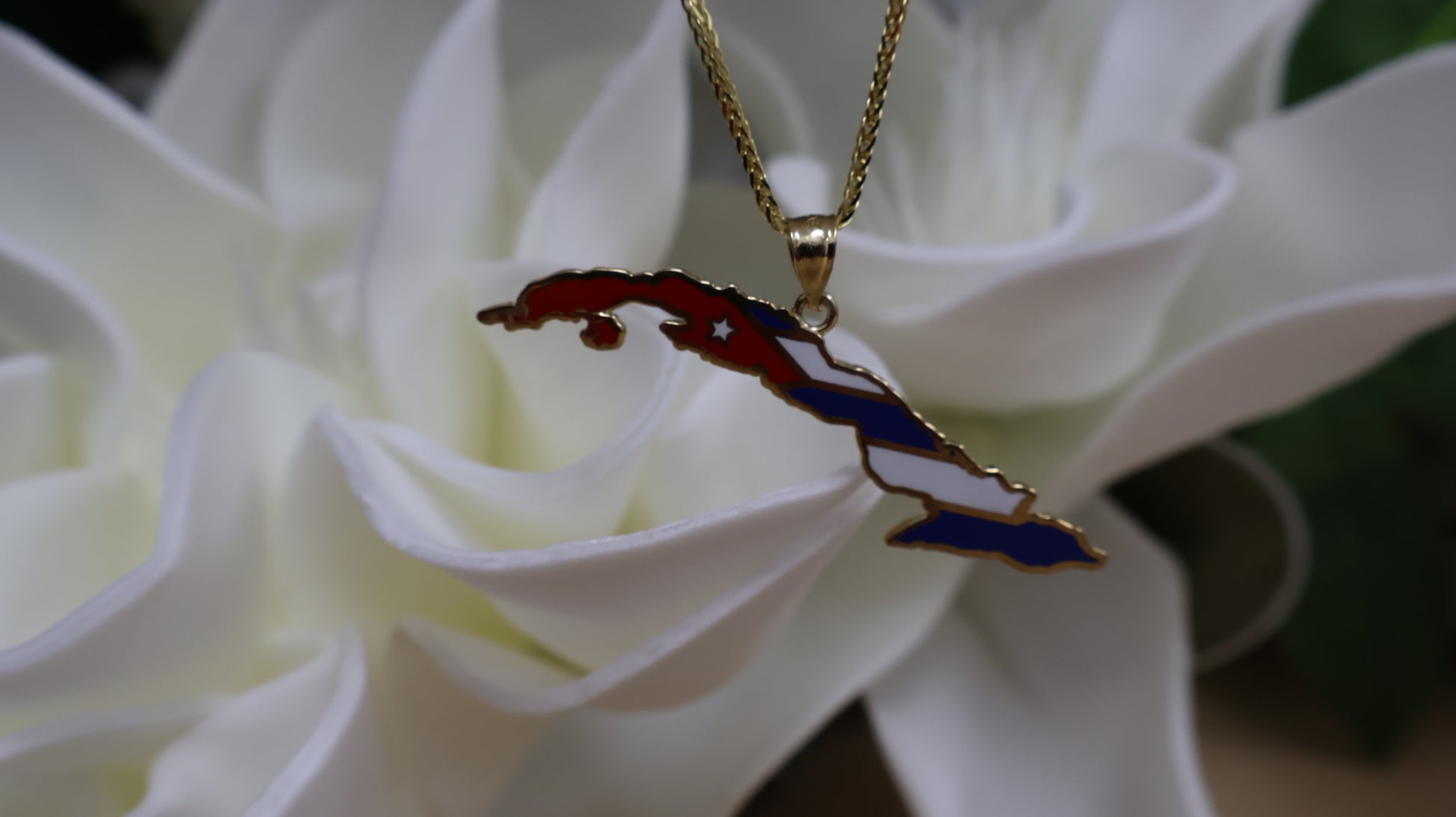 Este dije de 10k con el mapa de Cuba en colores de la bandera nacional es una pieza llena de orgullo y identidad. Su diseño vibrante y acabado en oro brillante lo convierten en un accesorio perfecto para quienes desean llevar consigo un símbolo de sus raíces con estilo y elegancia.