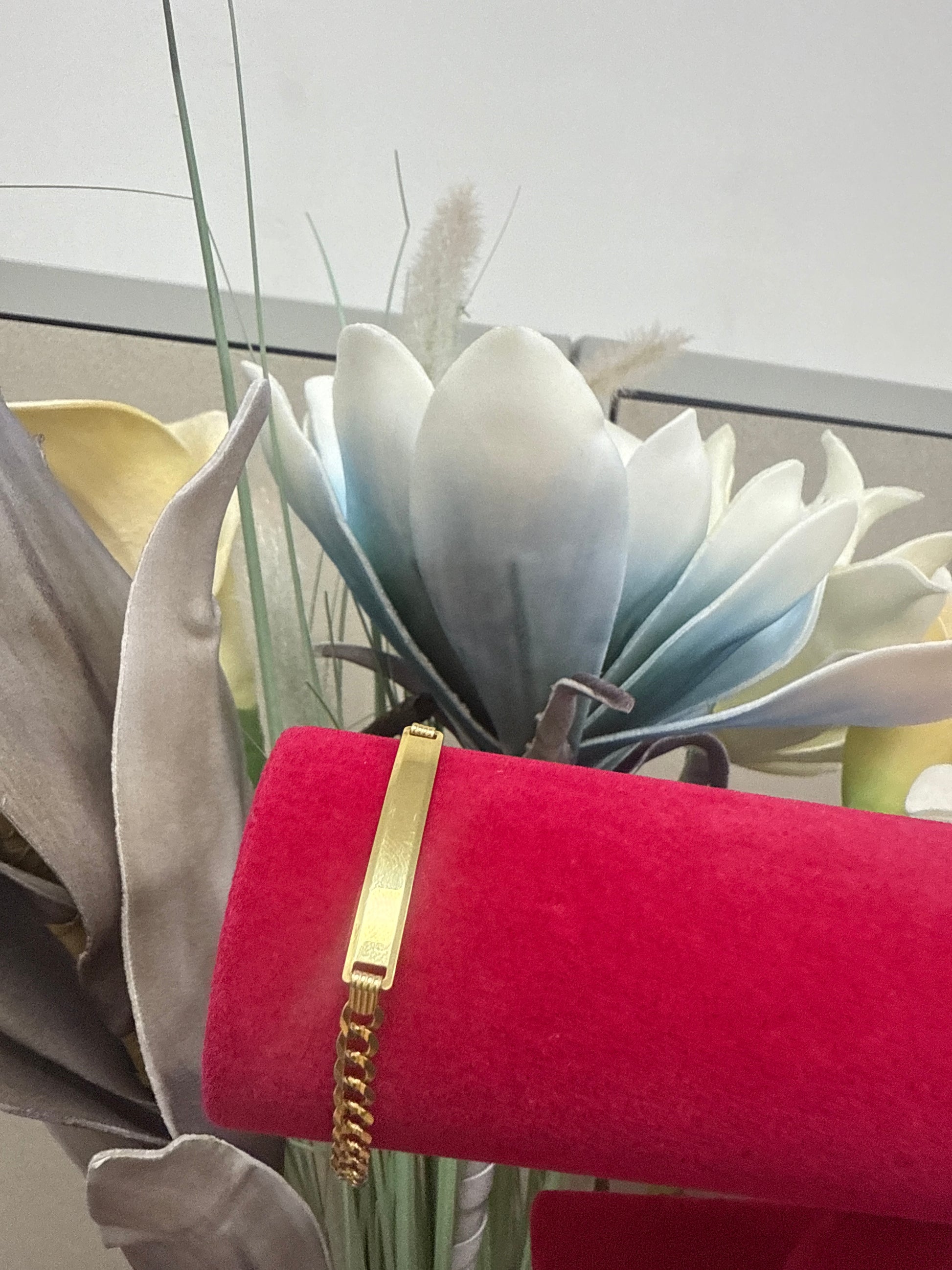Esta manilla femenina con placa de oro de 14k ofrece la posibilidad de un grabado personalizado, permitiéndote crear una pieza única y elegante. Su diseño refinado realza cualquier look, combinando lujo y significado en un accesorio exclusivo.
