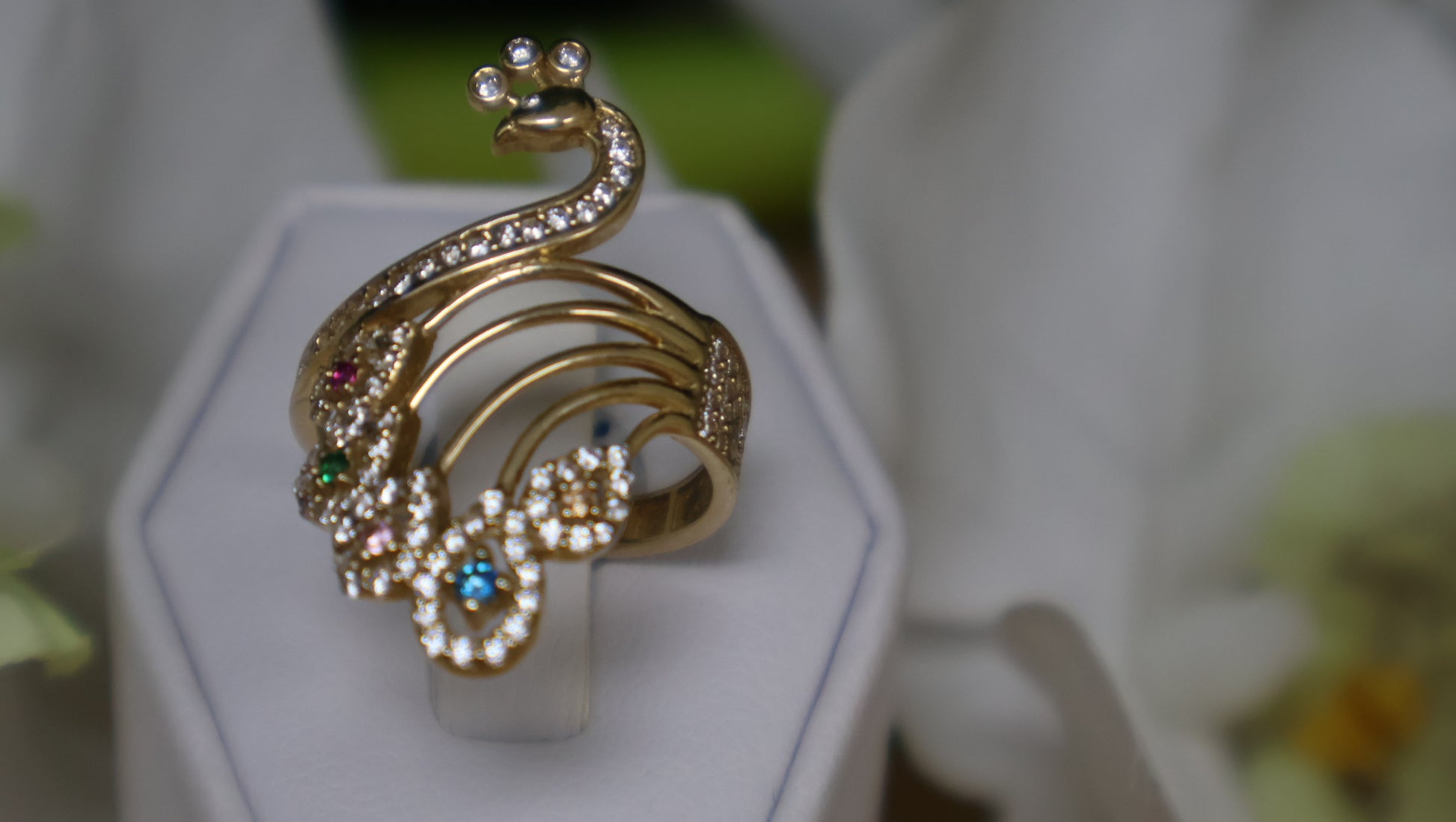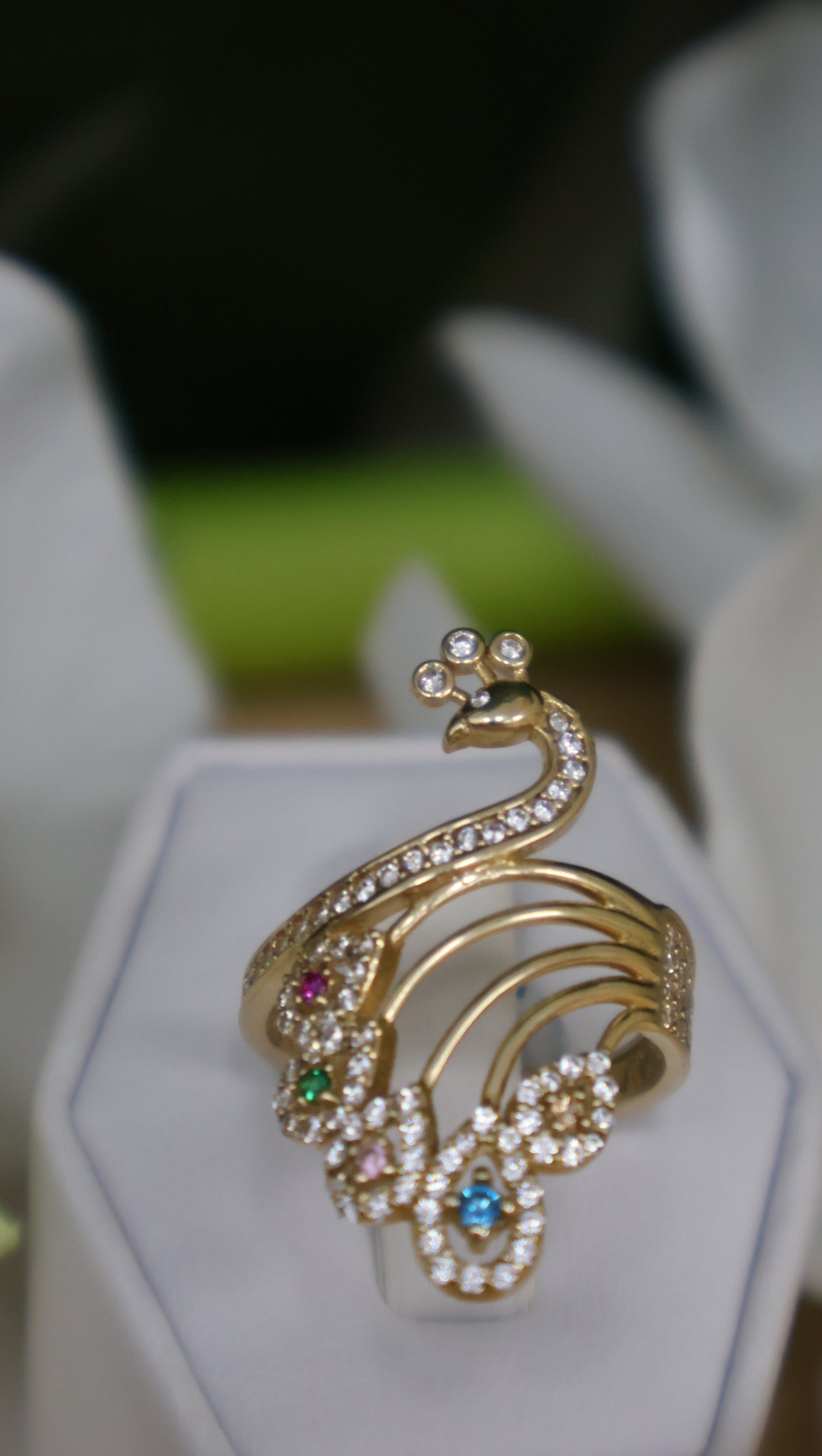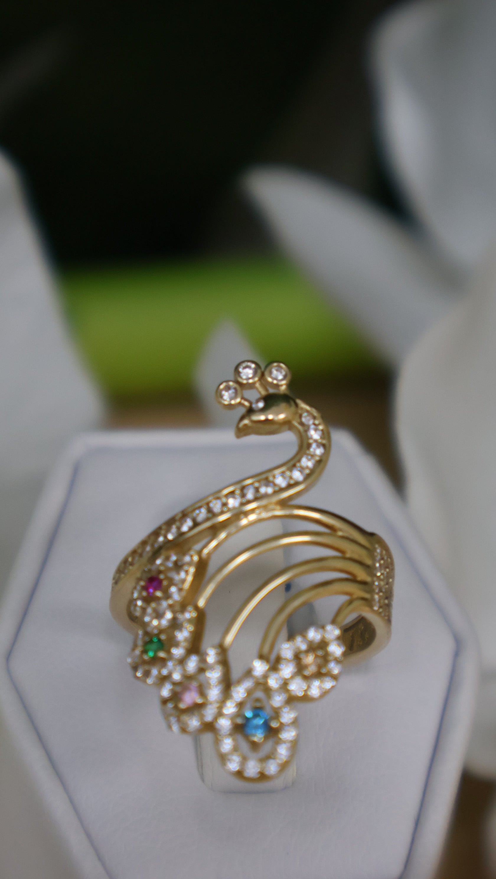 anillo con diseno de pavo real de color blanca roja verde azul y amarilla de oro 14k
