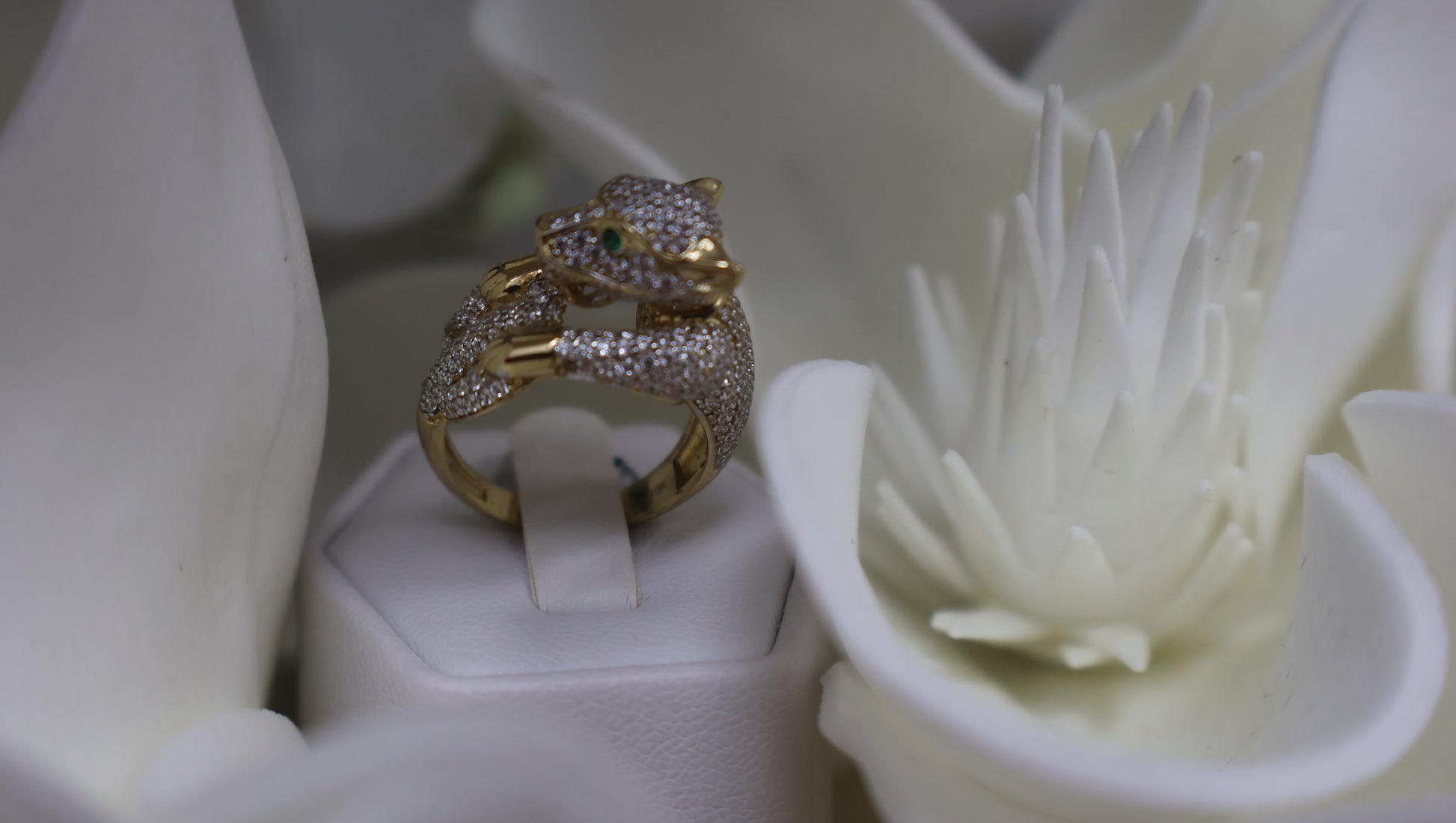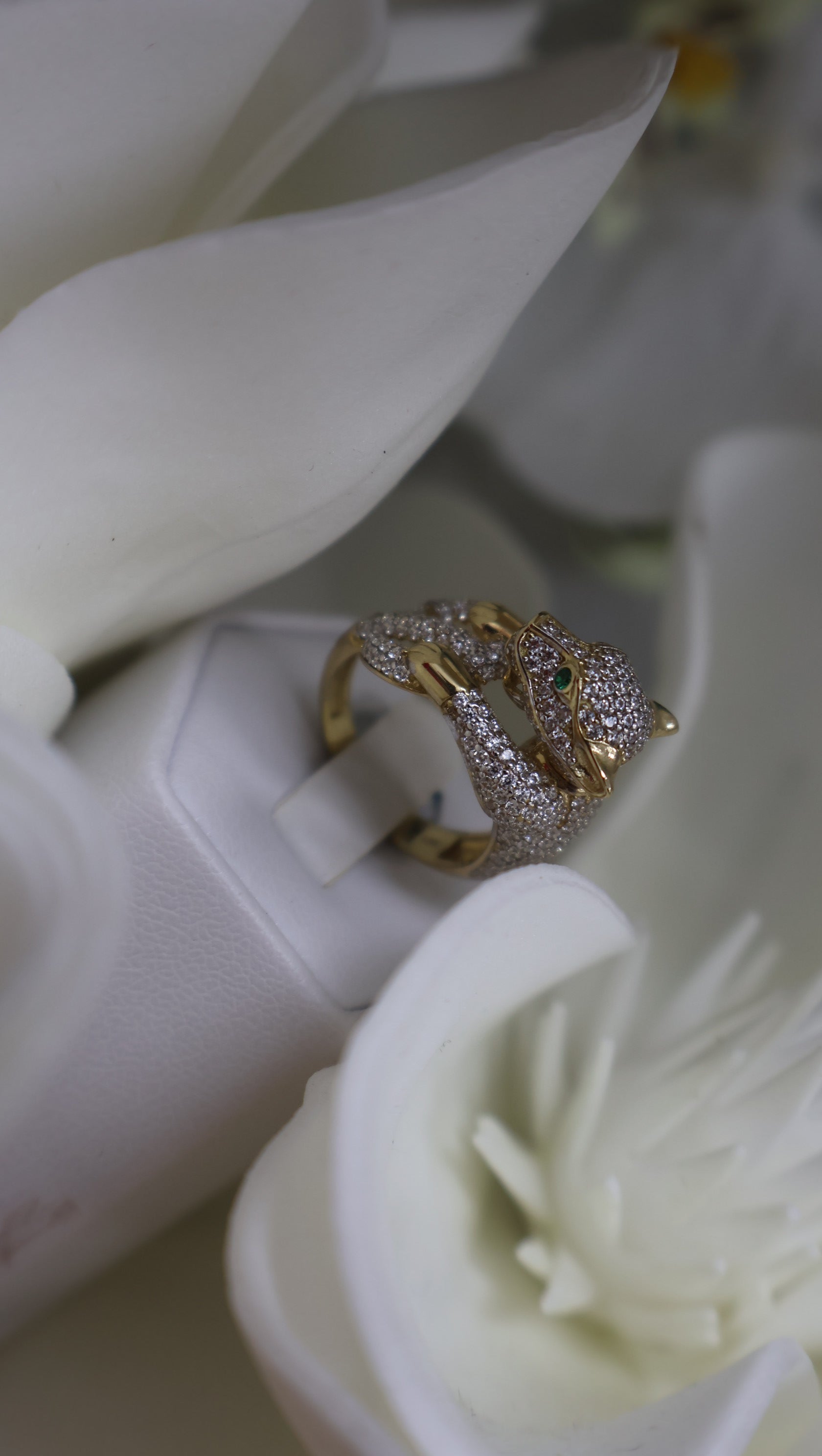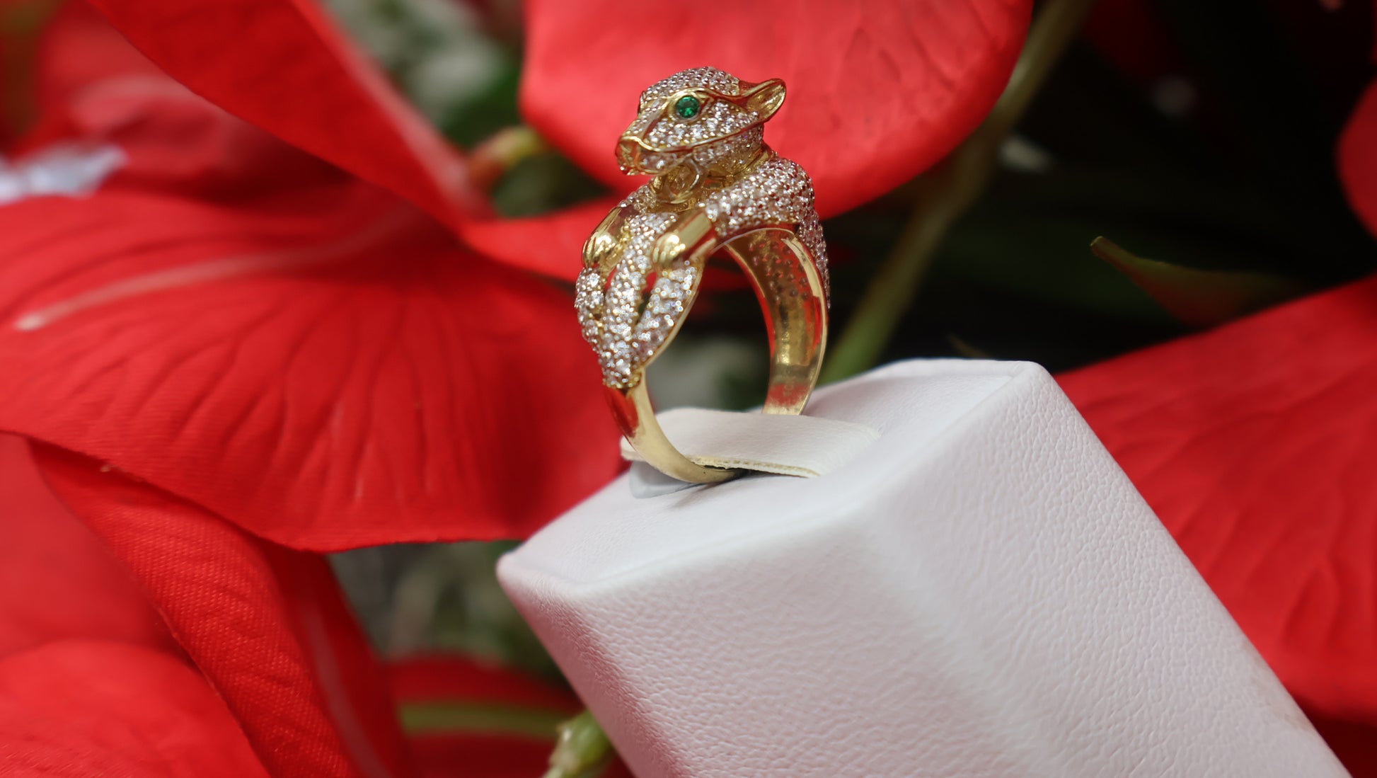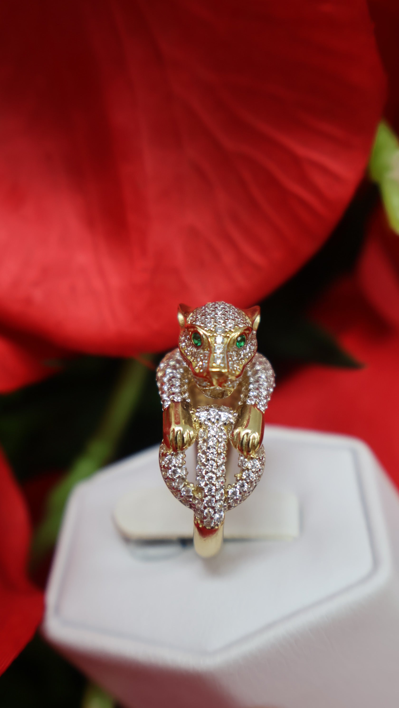Anillo de mujer con una pantera en oro 10k con circonia blanca y ojos en verde