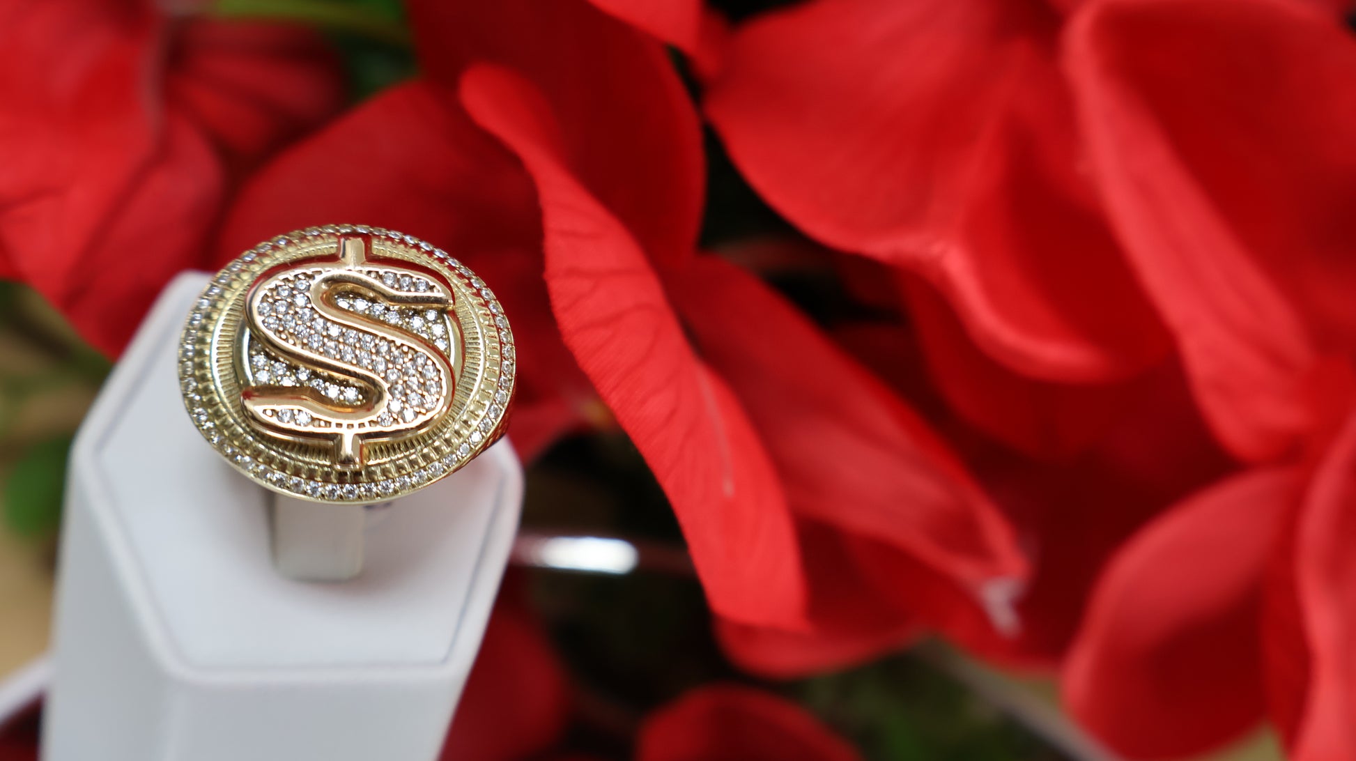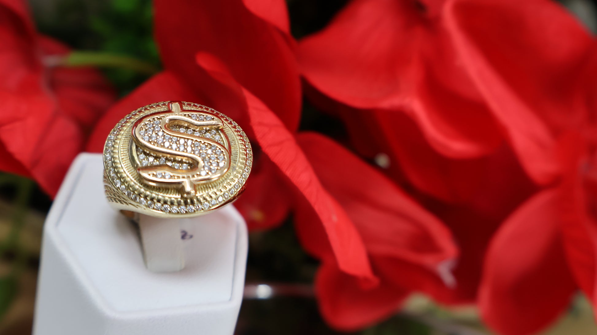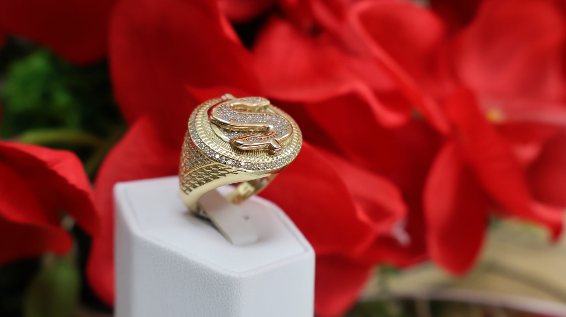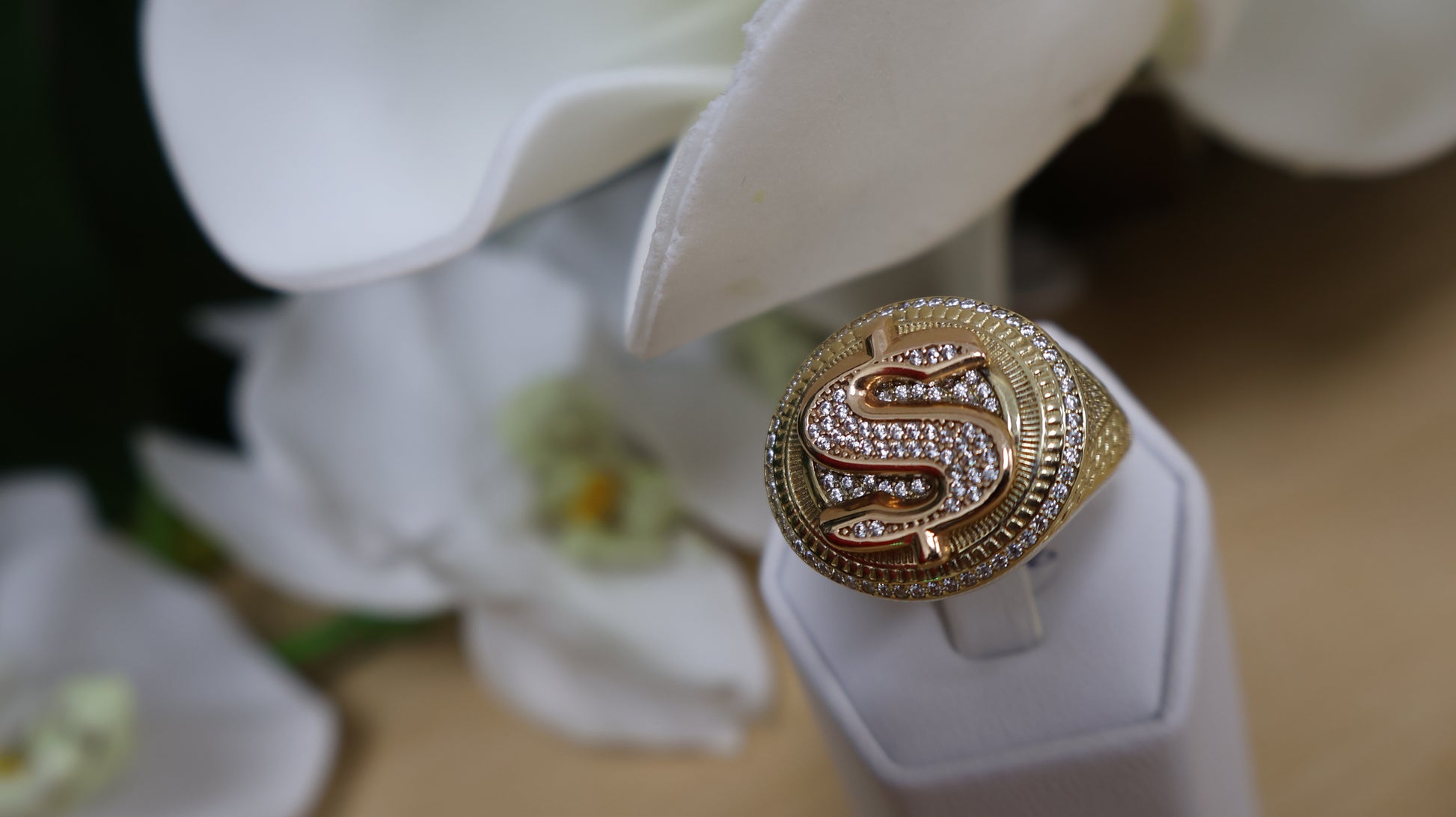 anillo de oro 14k de hombre con el signo de $ con sirconia en blancas