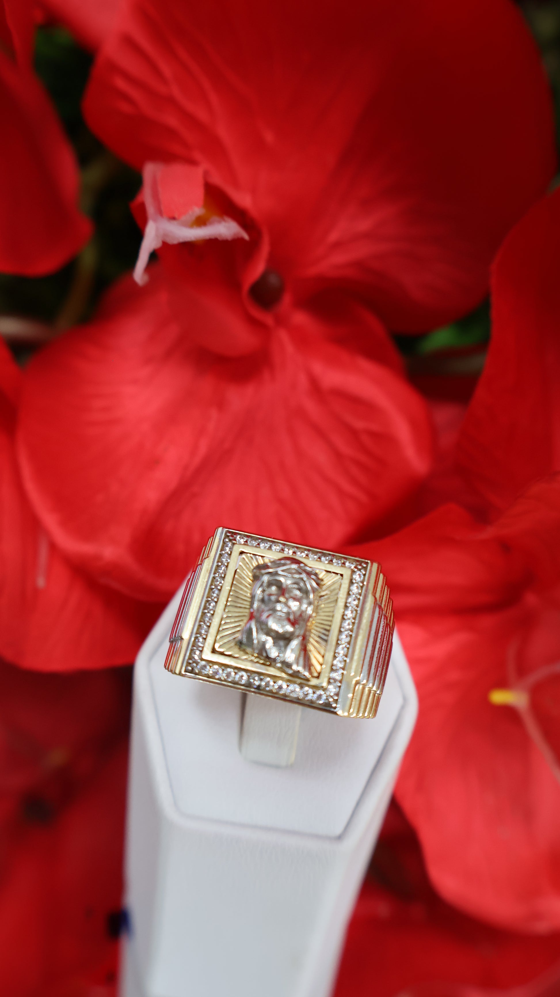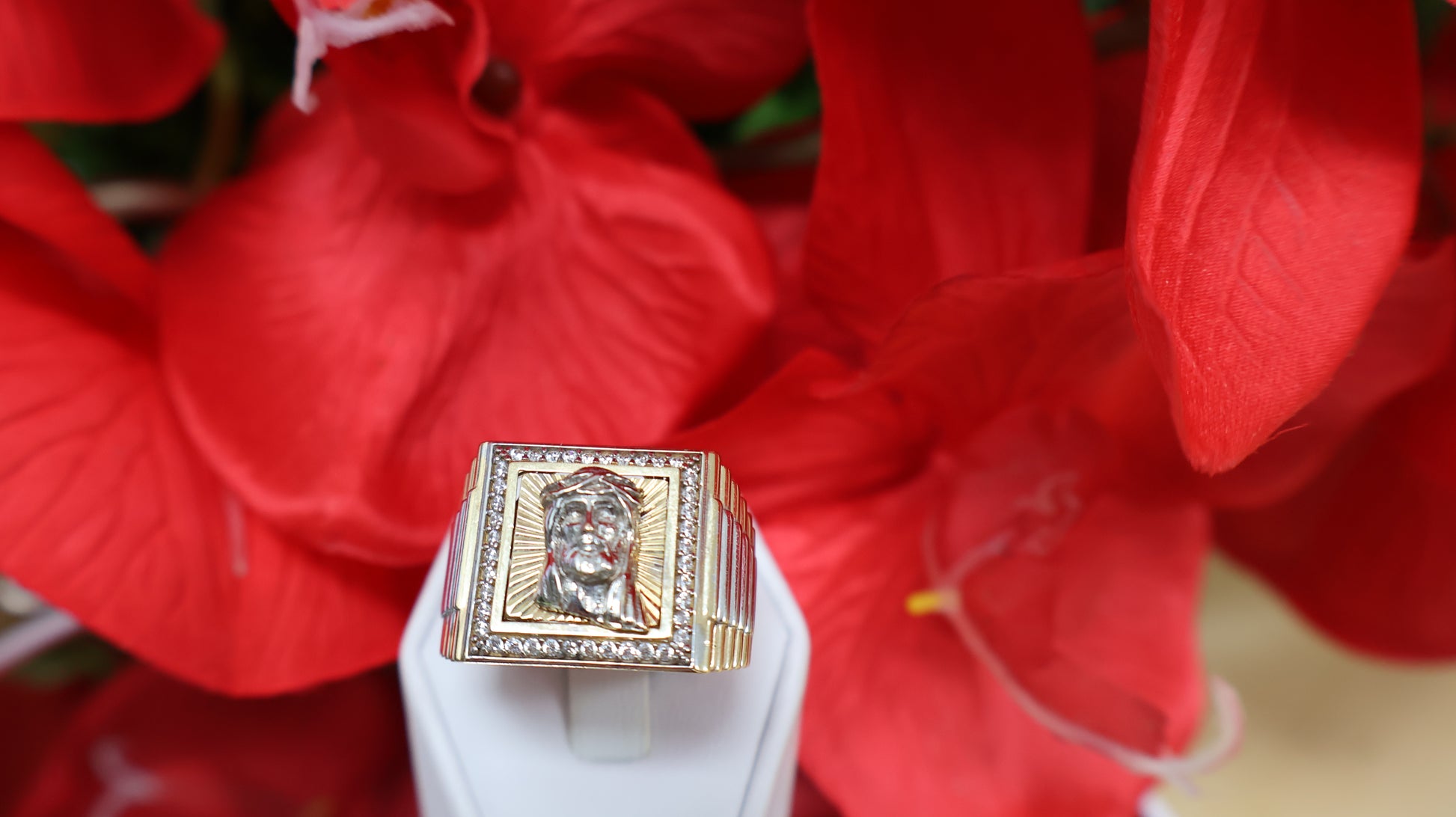 anillo de 14k con cristo y ciconia