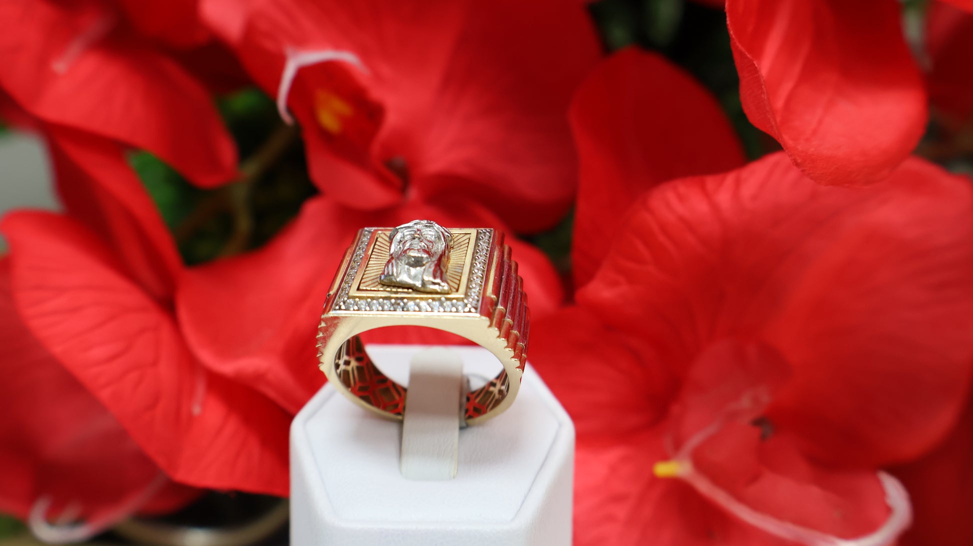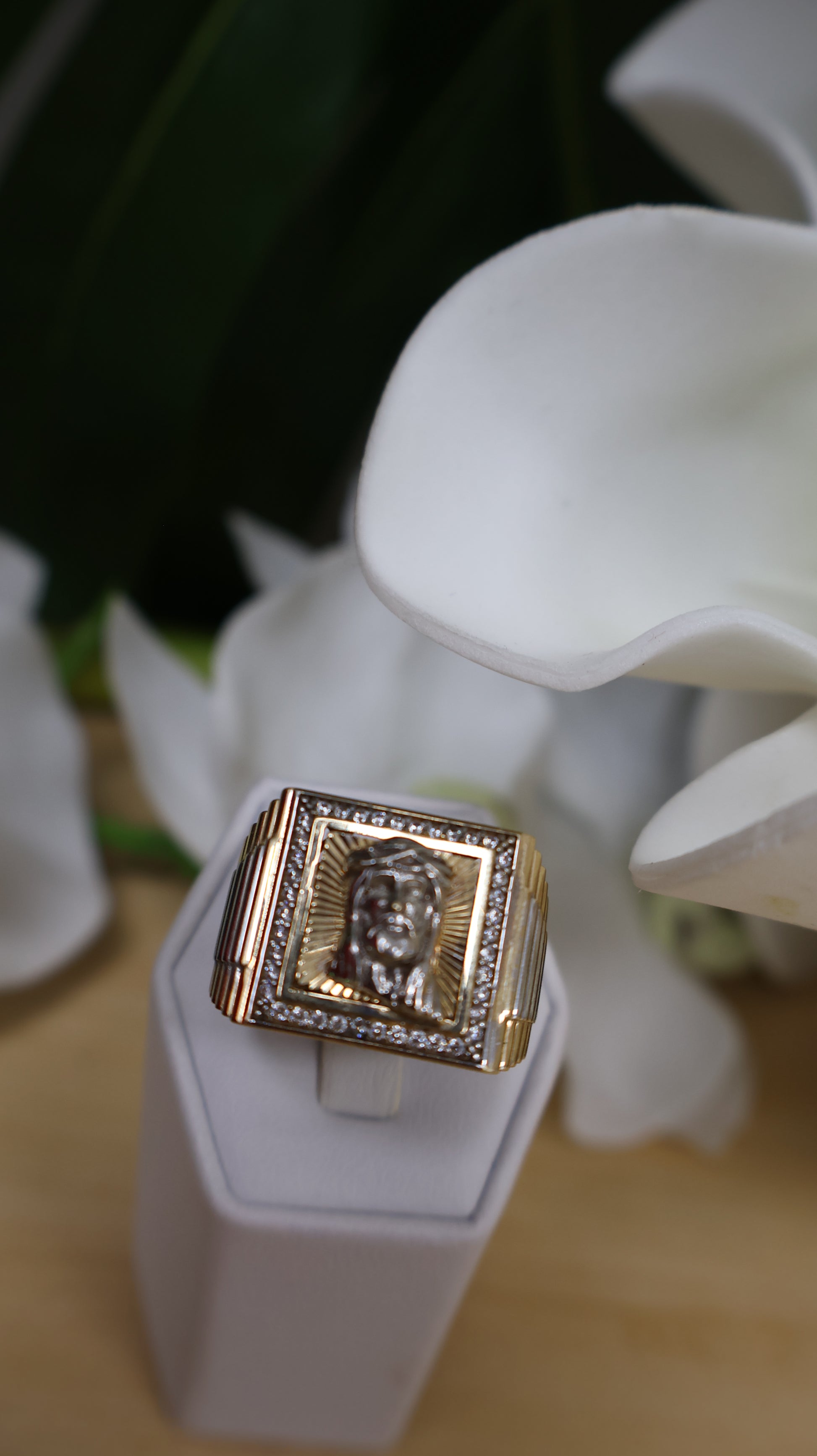 Este anillo de 14k combina la imagen de Cristo con un delicado detalle de ciconia, creando una pieza que une fe y elegancia. Fabricado en oro puro, ofrece un diseño exclusivo que resalta tu devoción con estilo y sofisticación.