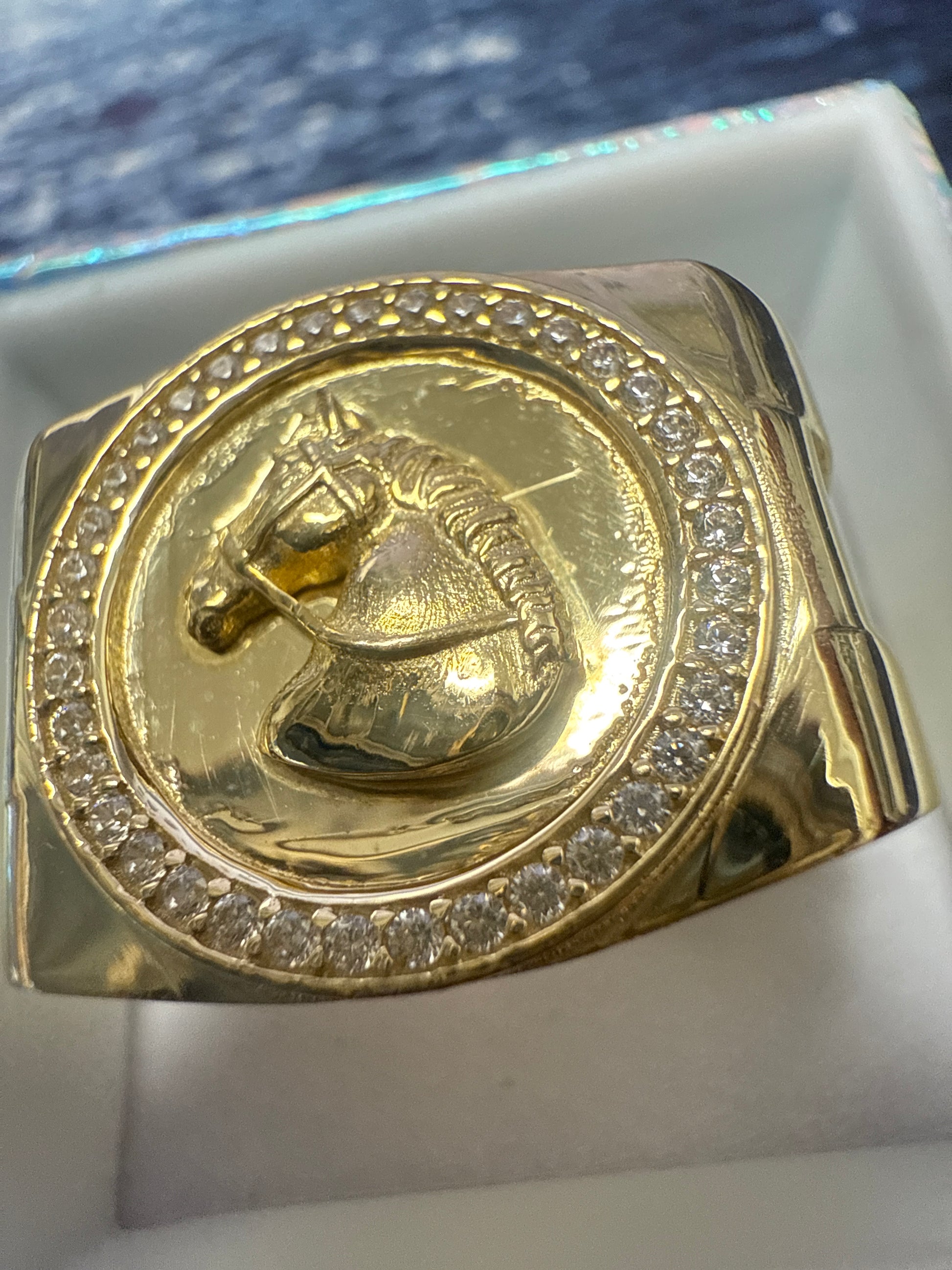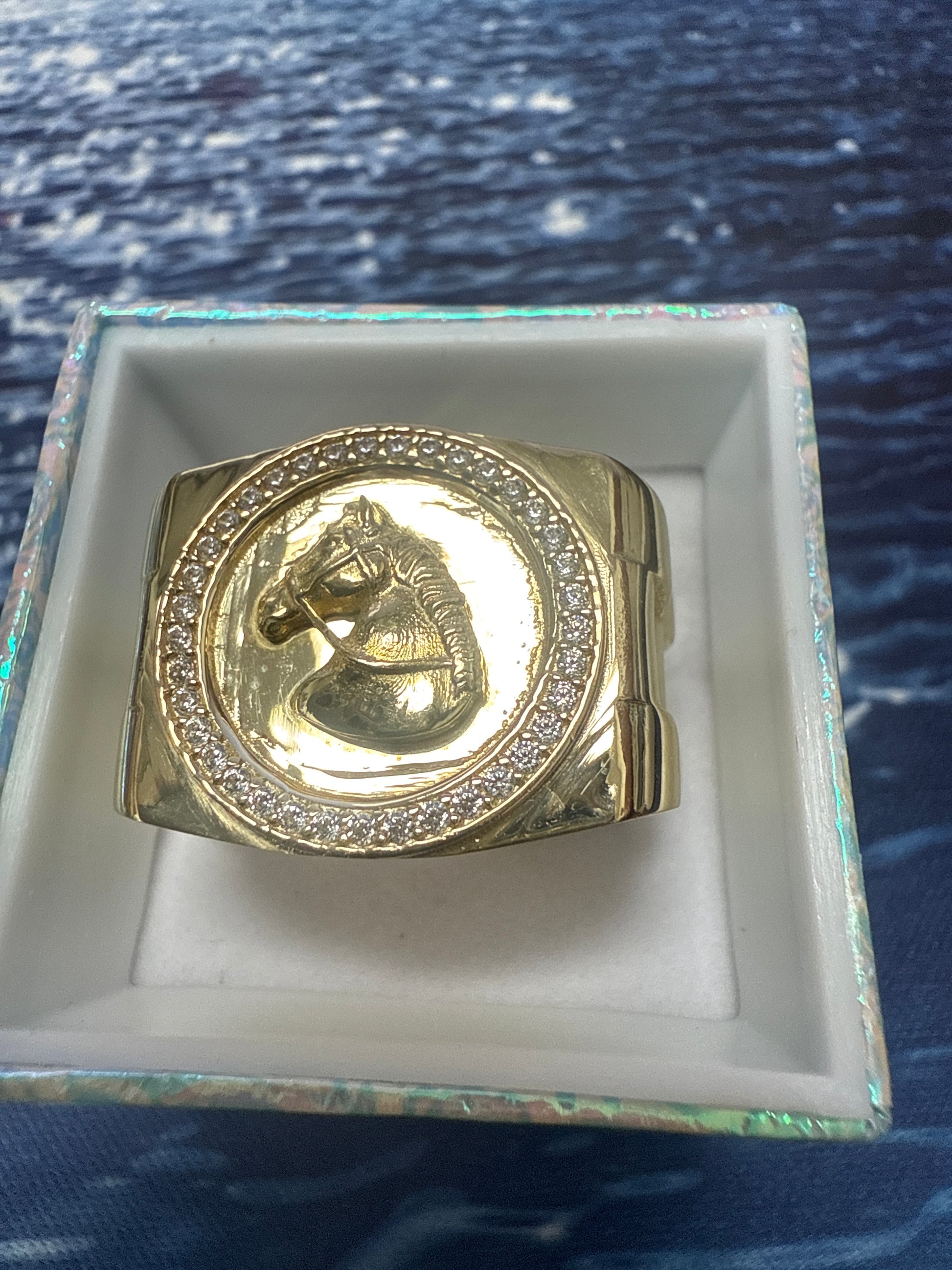 Este anillo de oro 10 k, con su precioso diseño de caballo es perfecto para un caballero elegante y con estilo. Hecho con materiales de alta calidad, este anillo no solo es una verdadera joya, sino que también es duradero y resistente.