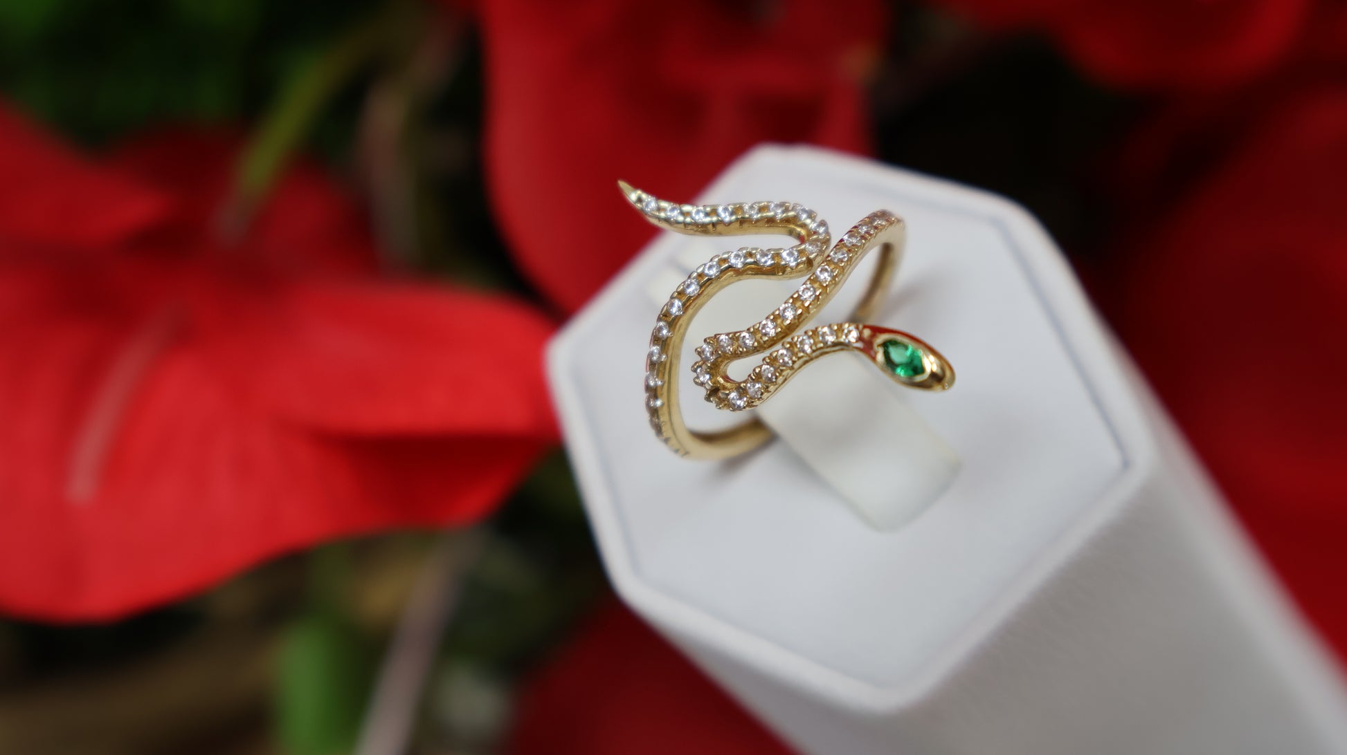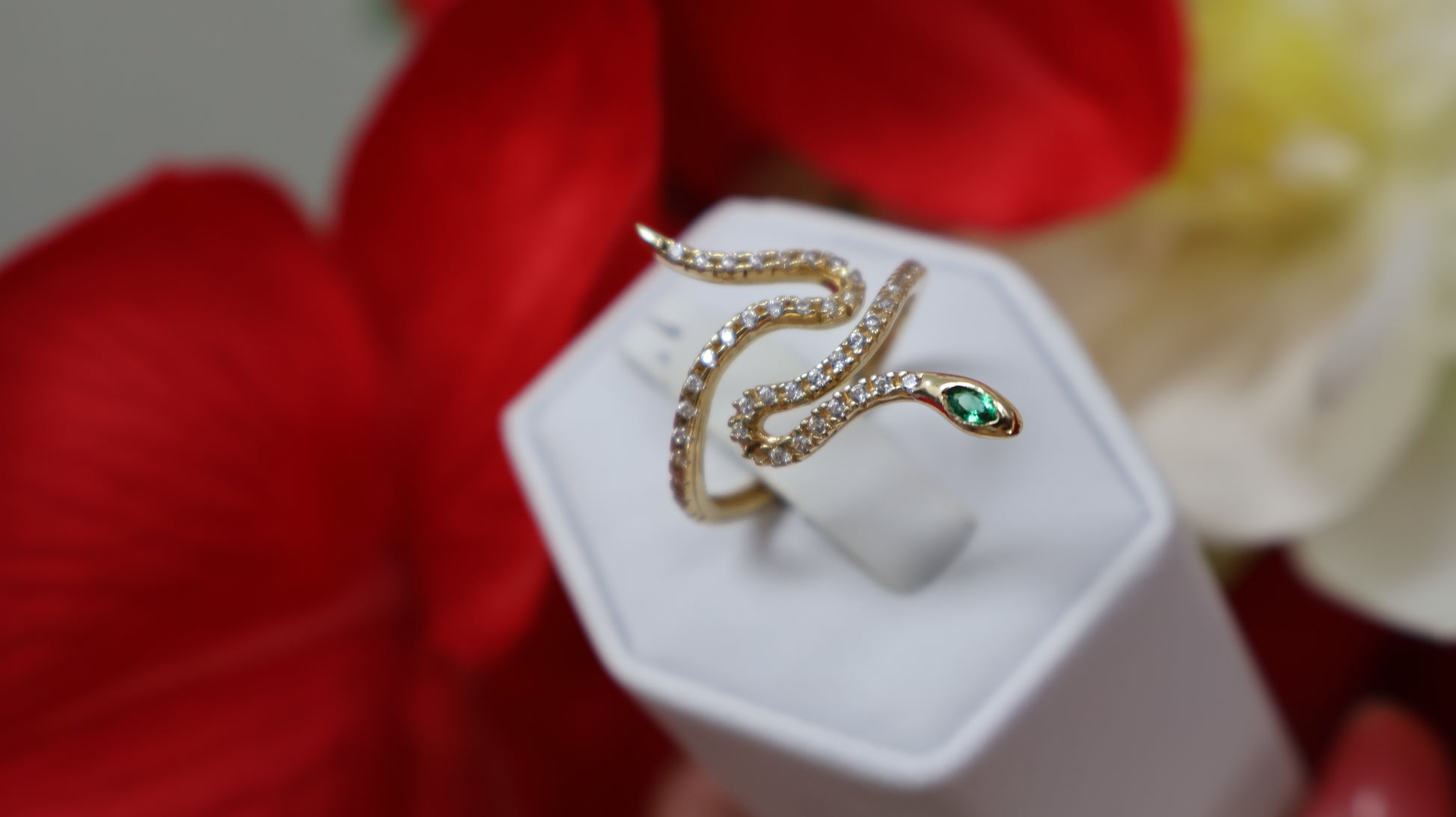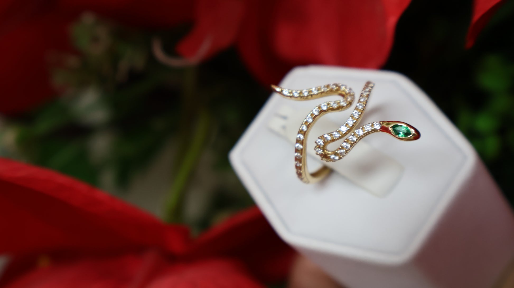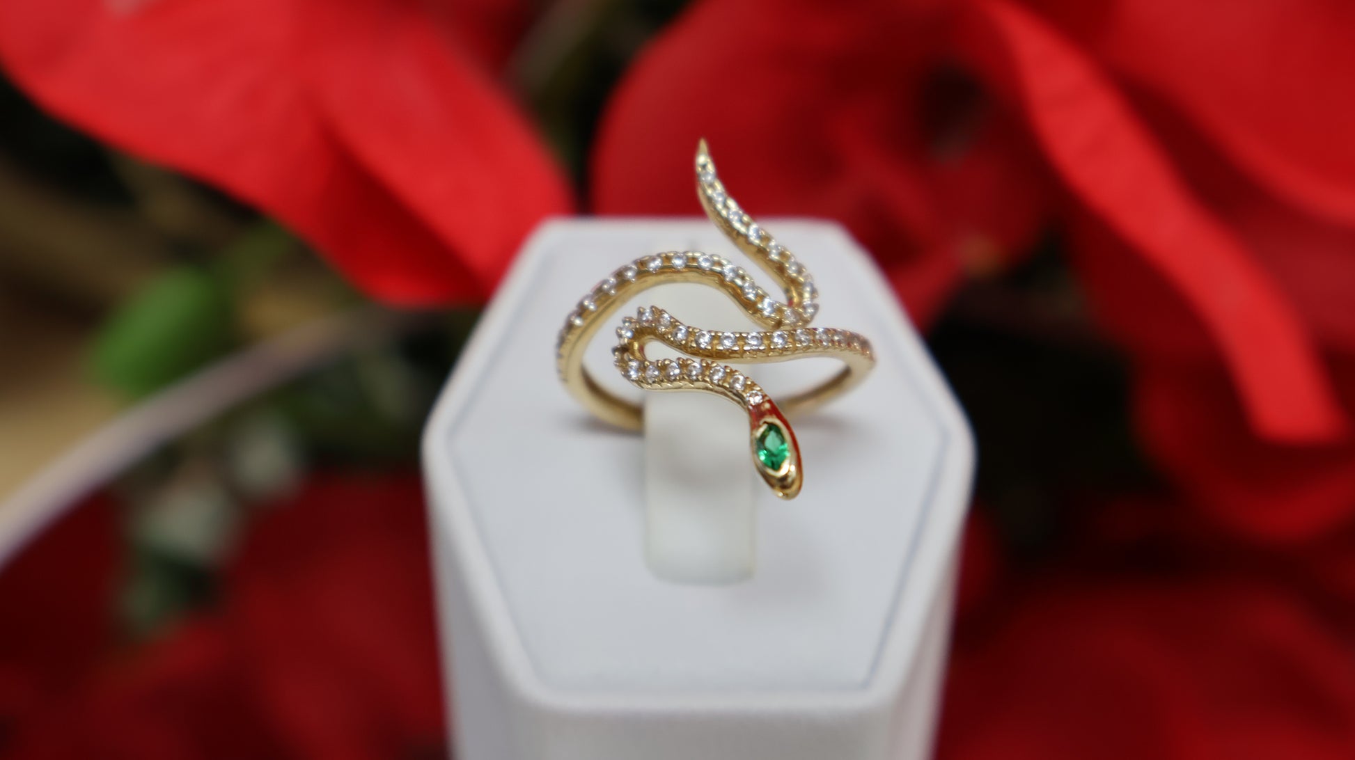anillo de mujer 14k de serpiente ojo verde y sirconia