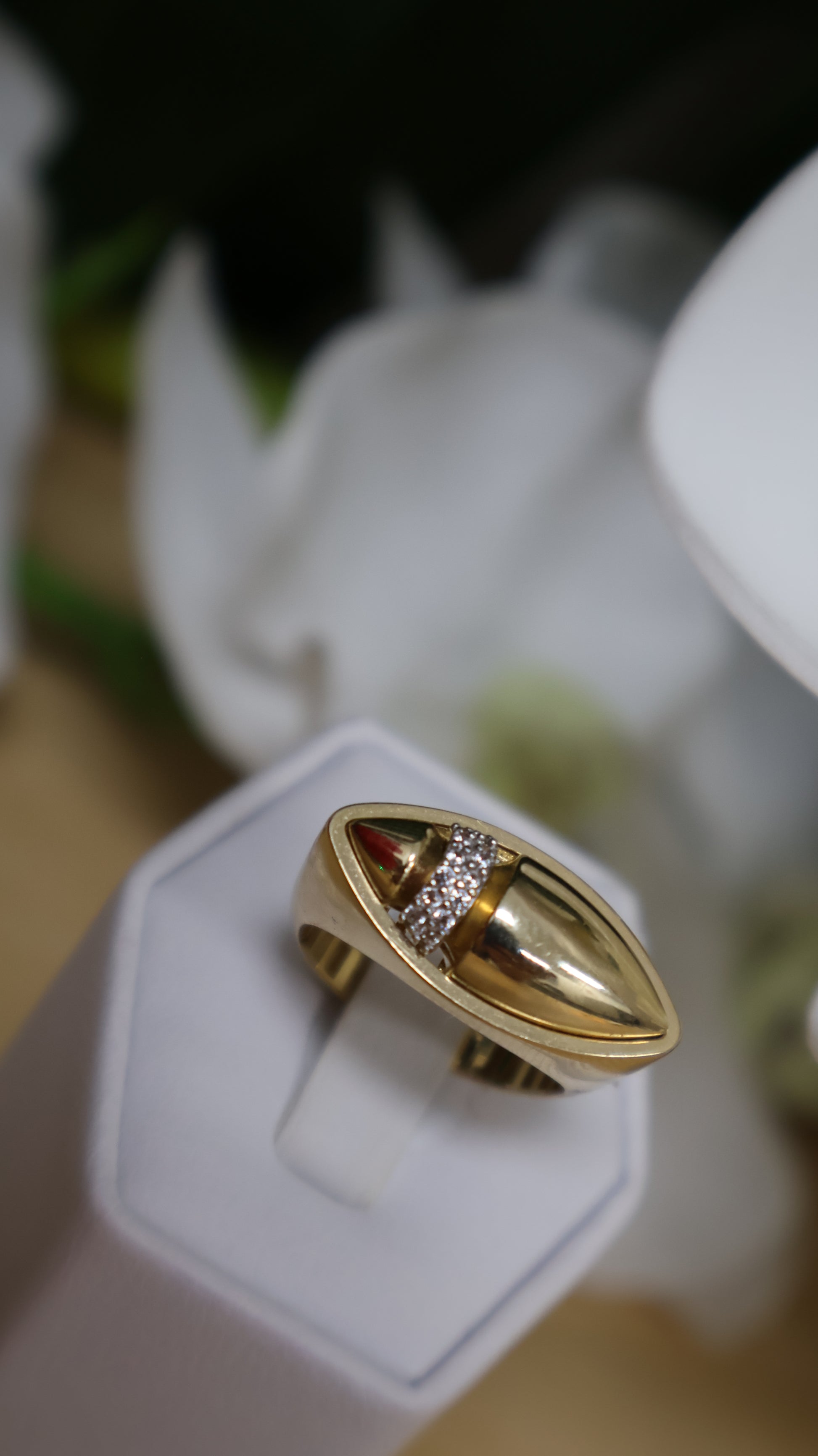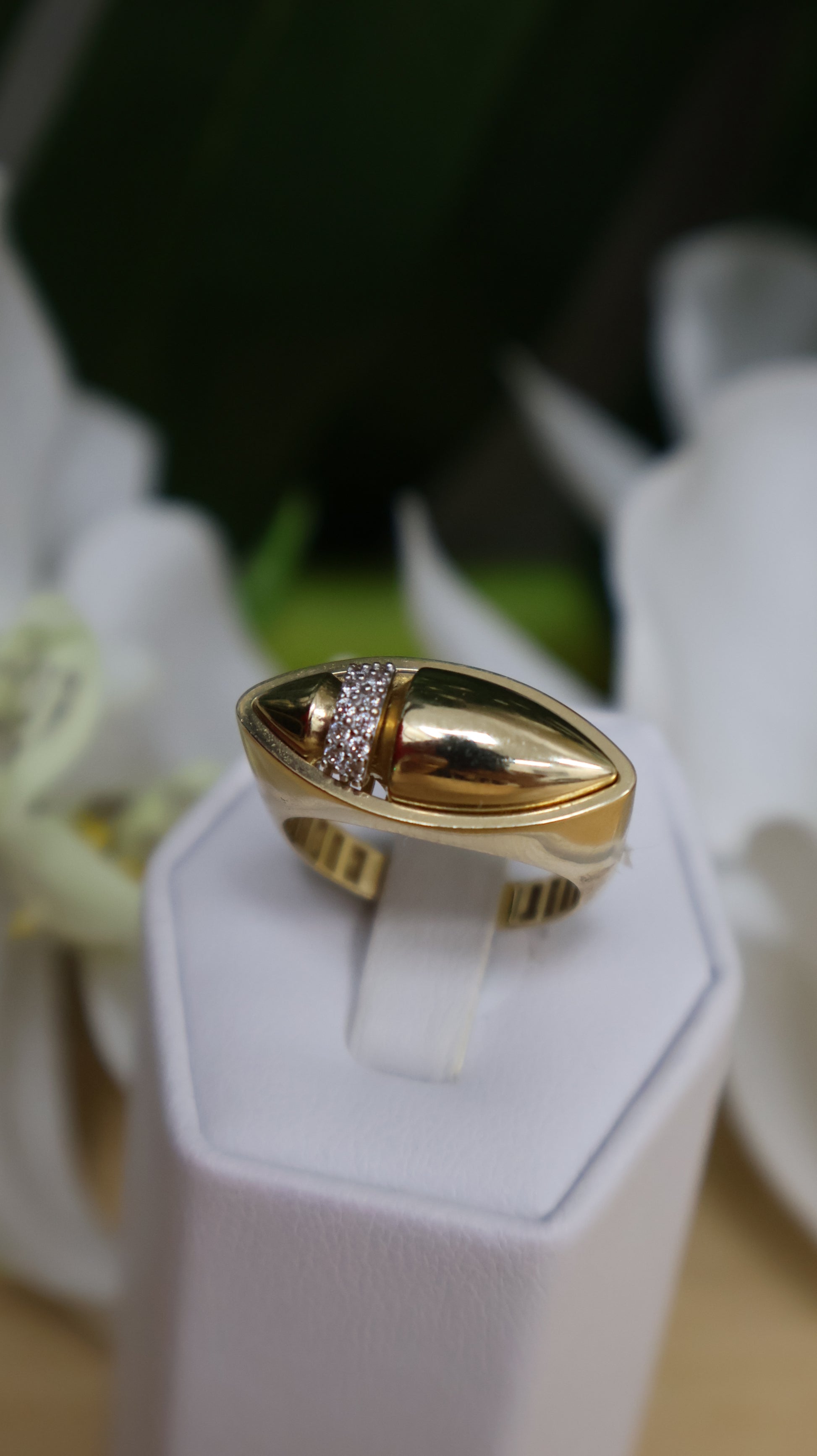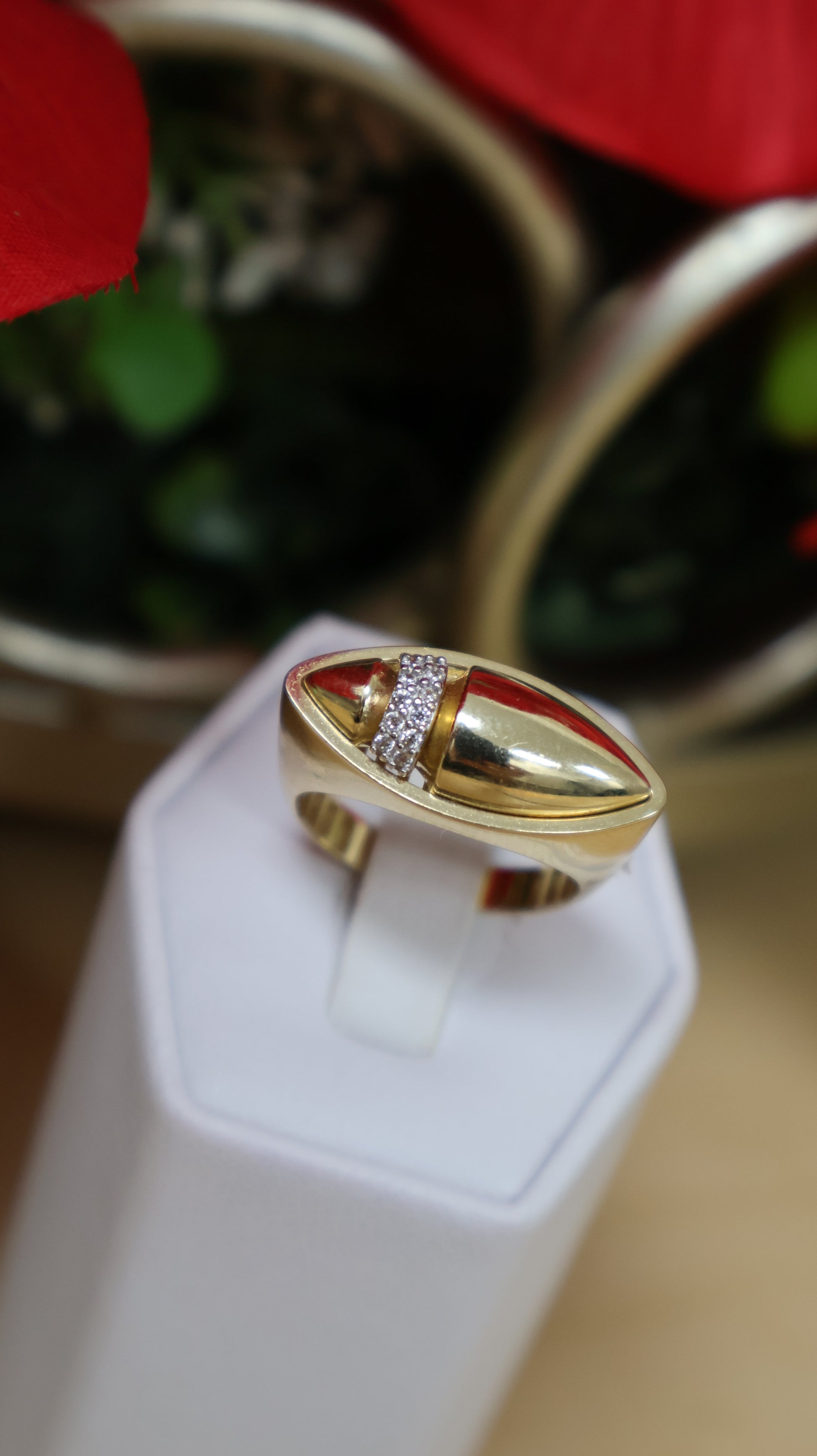 Este anillo de mujer en oro de 14k destaca por su diseño espacial, realzado con circonia blanca que aporta un brillo elegante y sofisticado. Una pieza única que combina modernidad y delicadeza, perfecta para quienes buscan una joya con estilo y distinción.