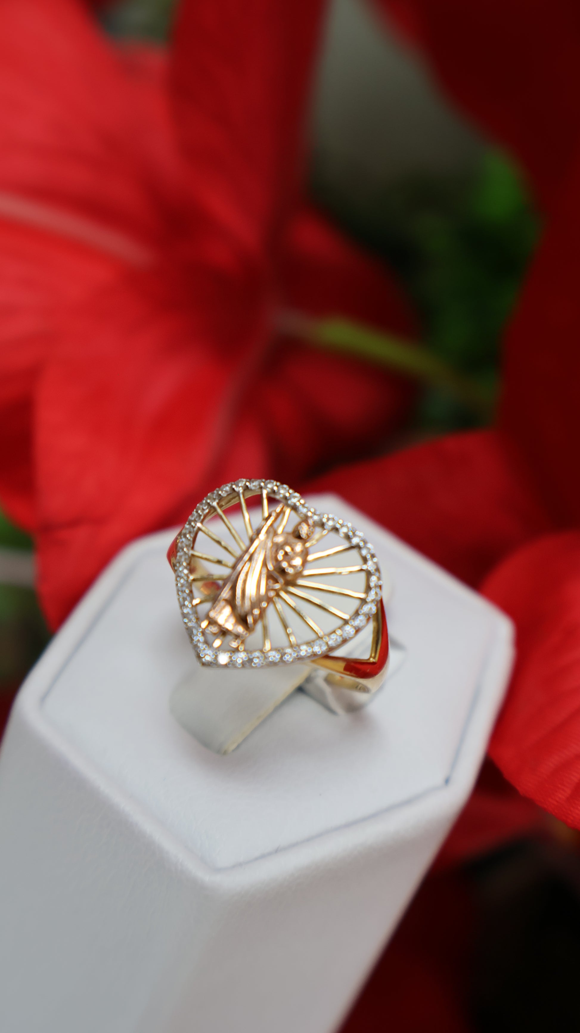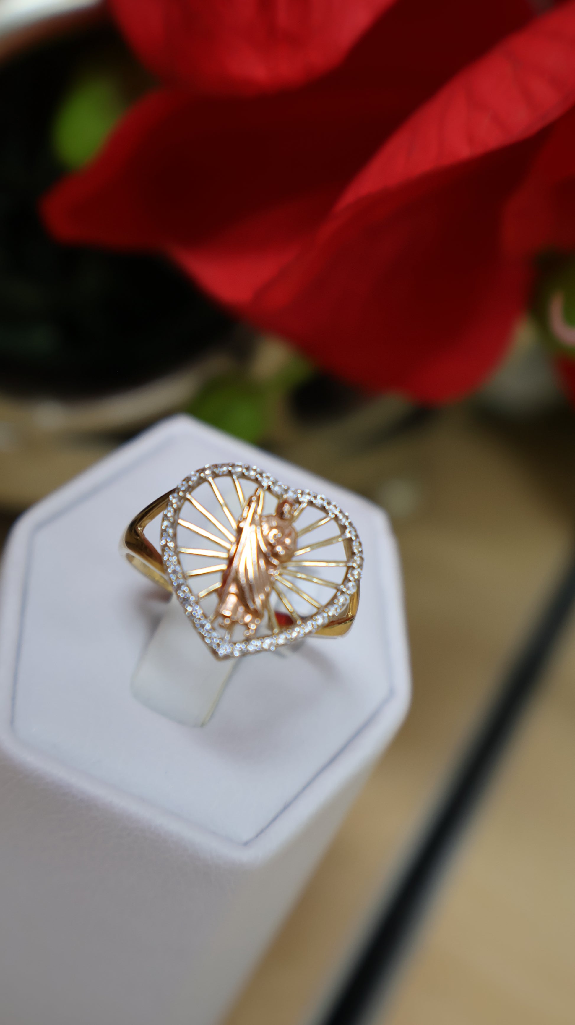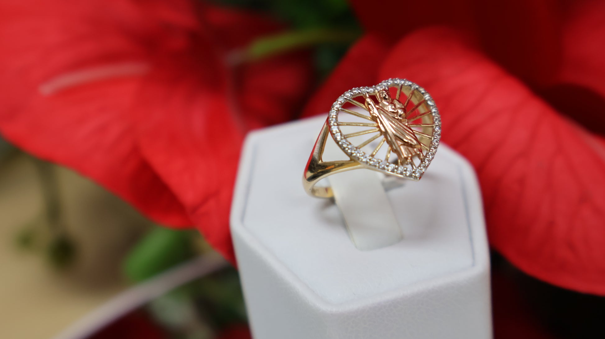 Este anillo de mujer en oro 14k de dos tonos presenta un diseño inspirado en San Judas, que combina tradición y elegancia con un estilo sofisticado. Su acabado bicolor realza los detalles de la pieza, ofreciendo un accesorio exclusivo que aporta distinción y un significado especial, ideal para complementar cualquier look con un toque refinado y personal.