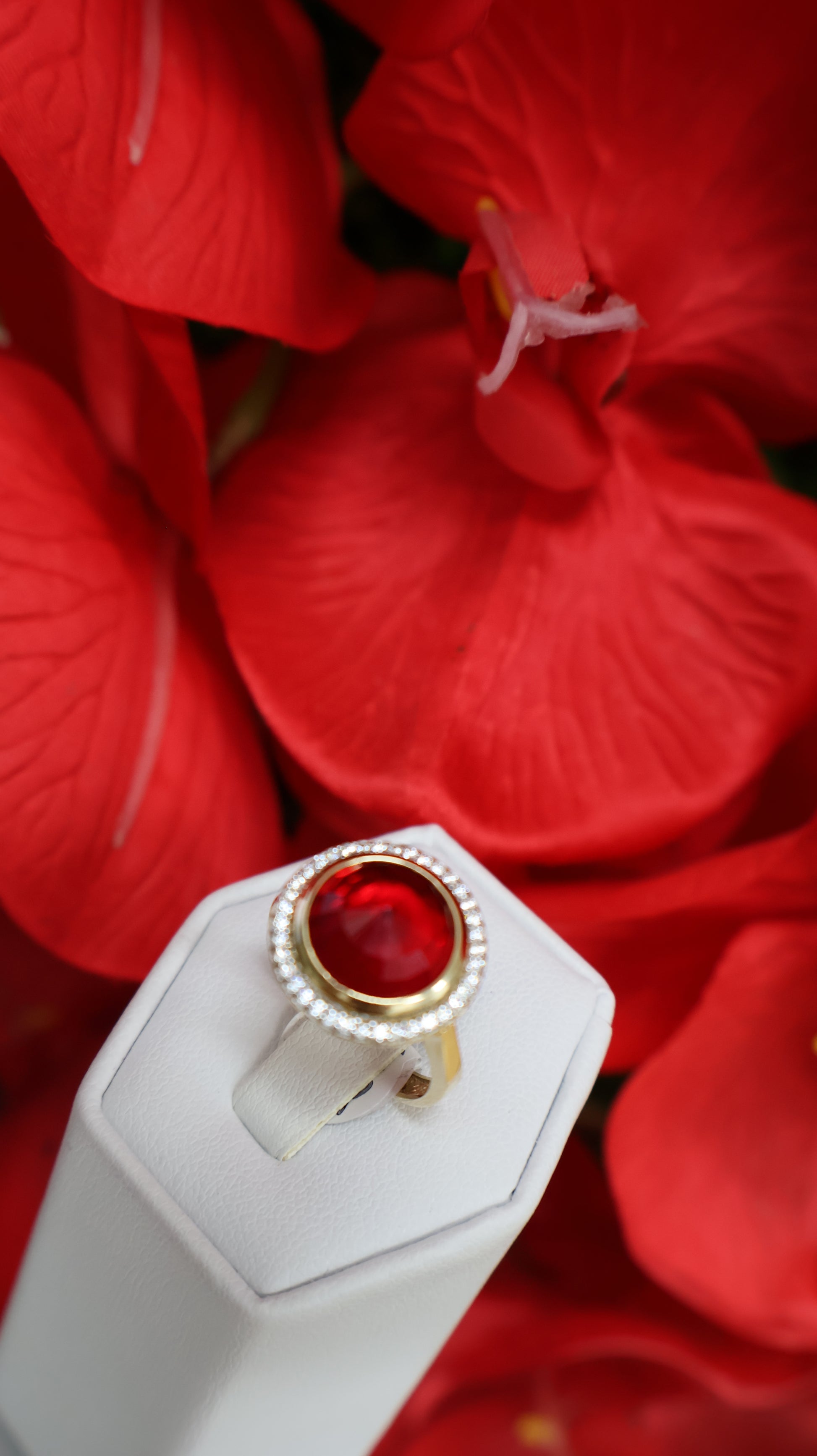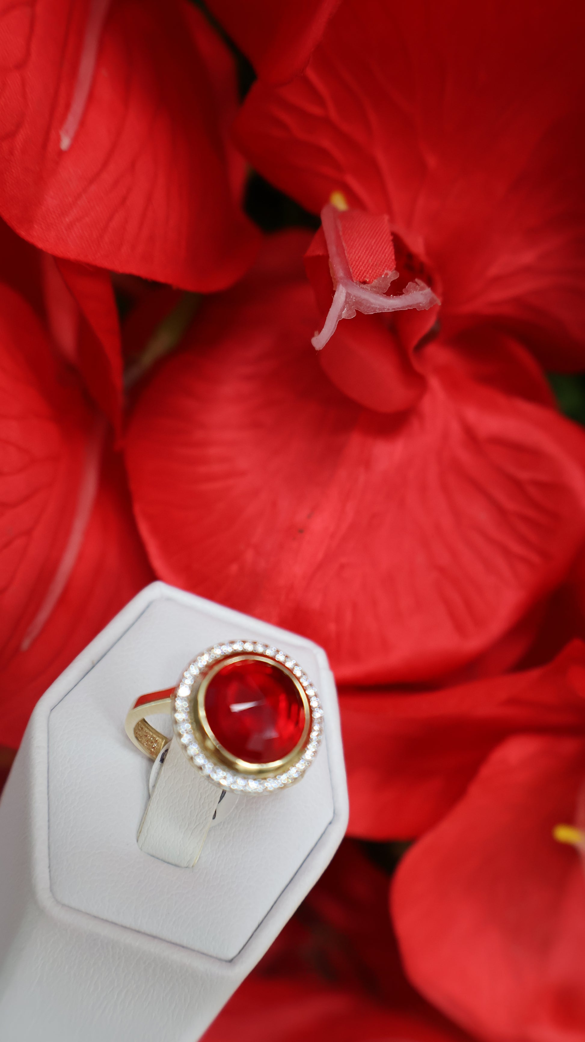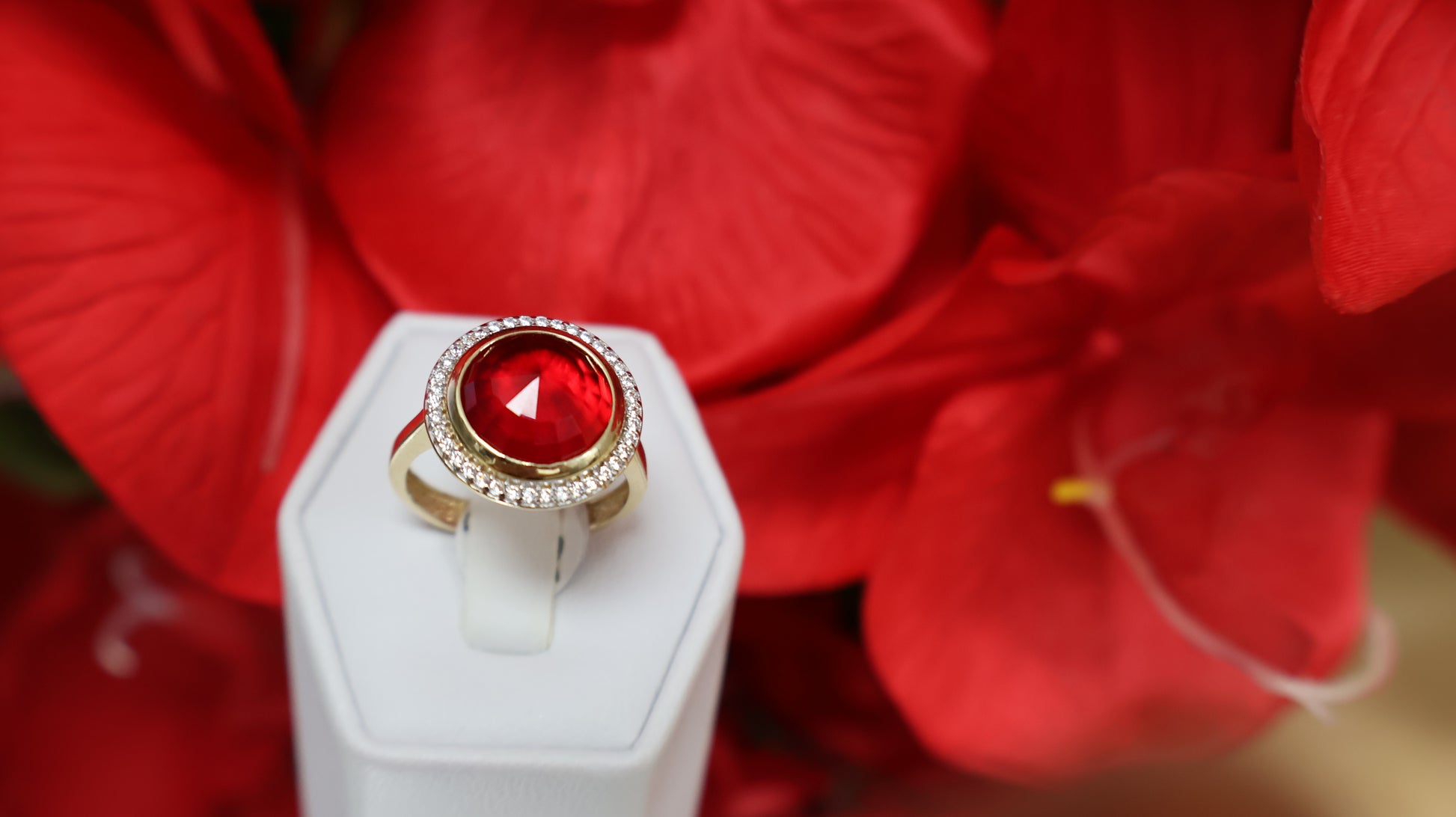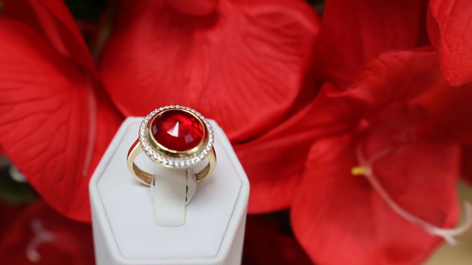 Anillo de mujer en oro 14k de piedra en roja y con sirconia en blanca