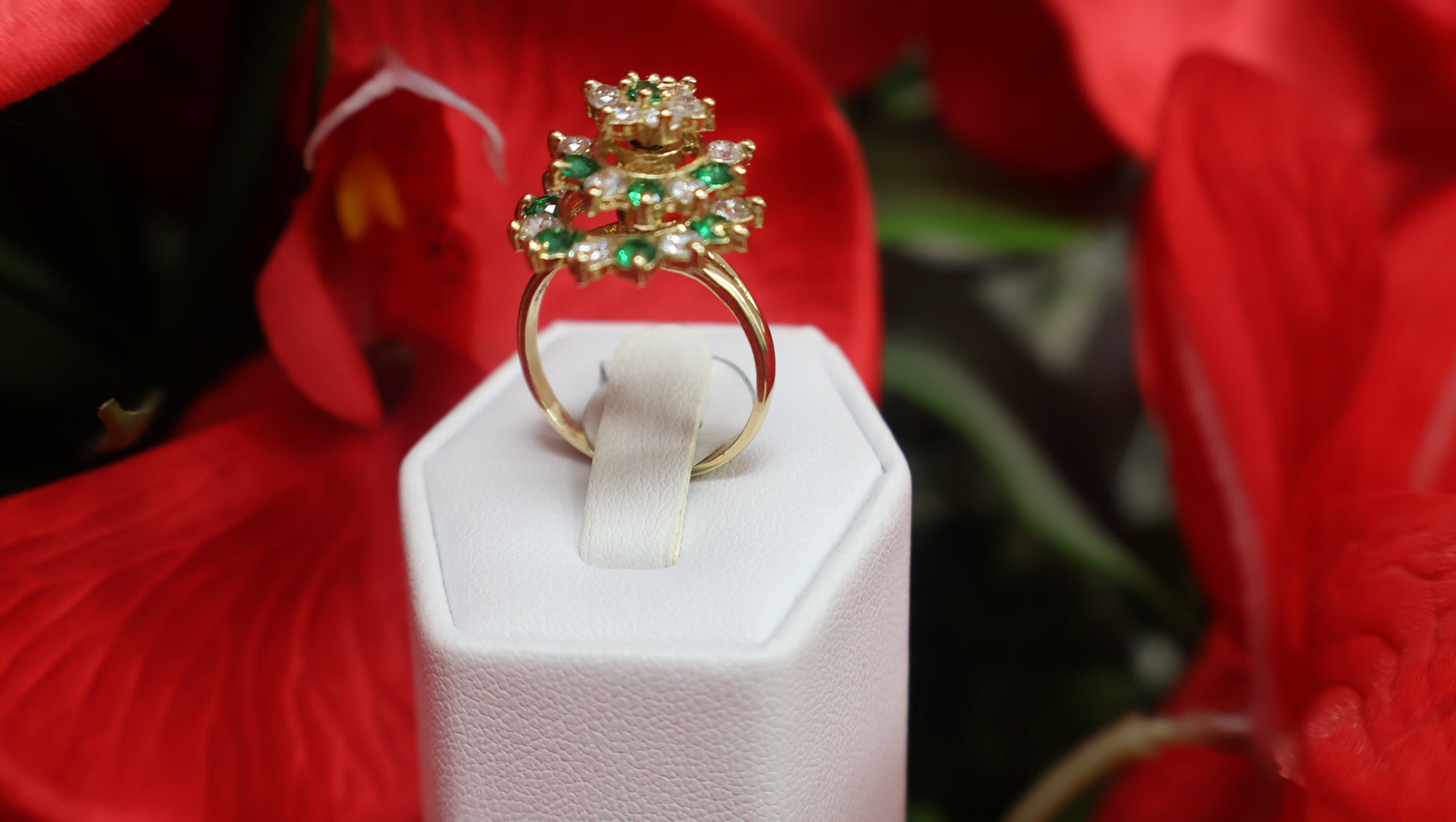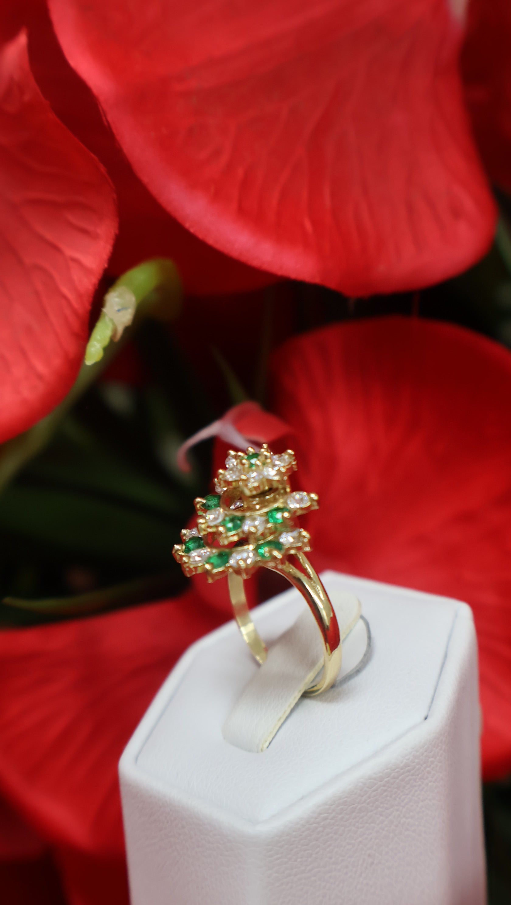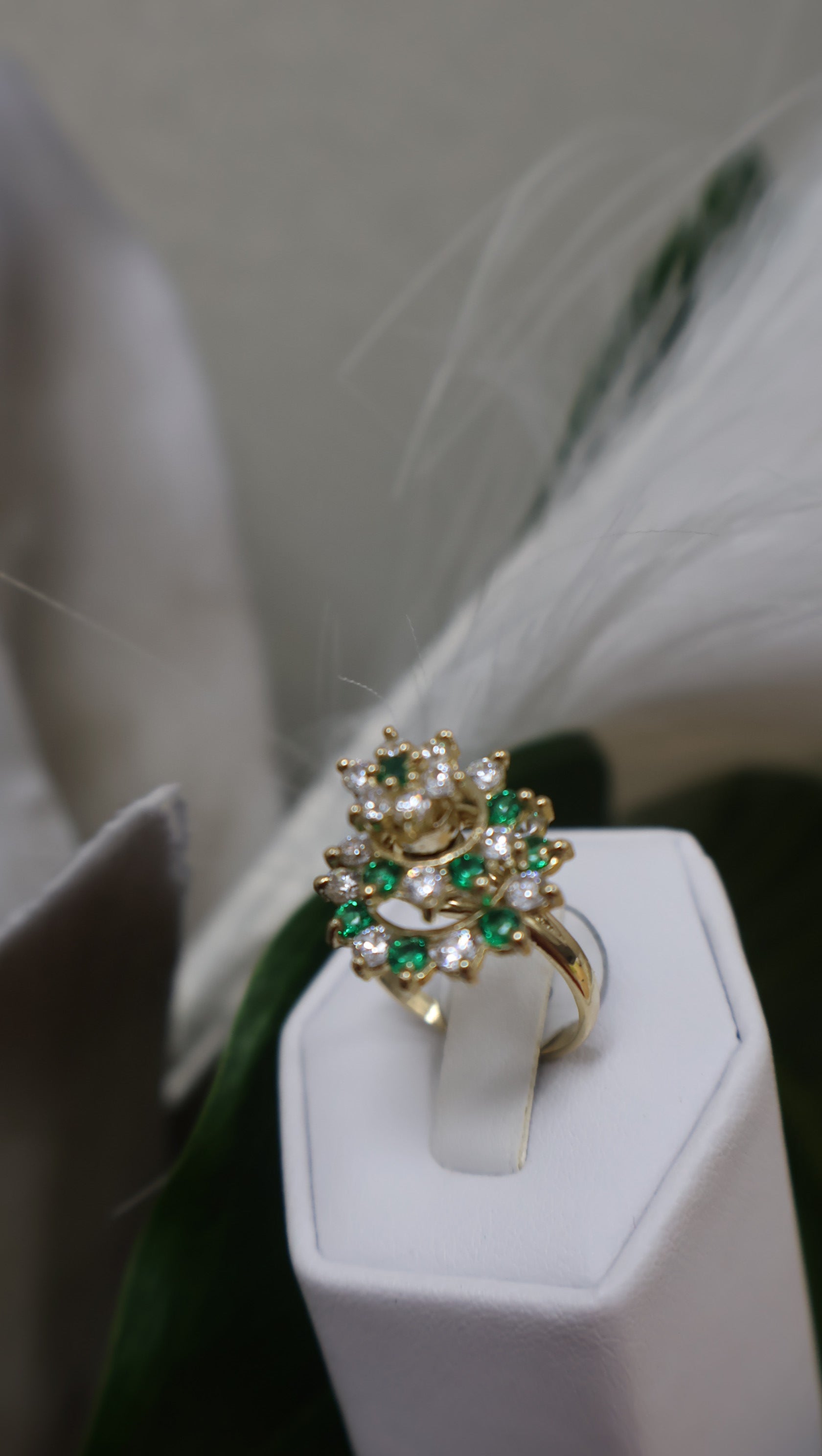 anillo giratorio con sirconia verde y blanca en oro 10k