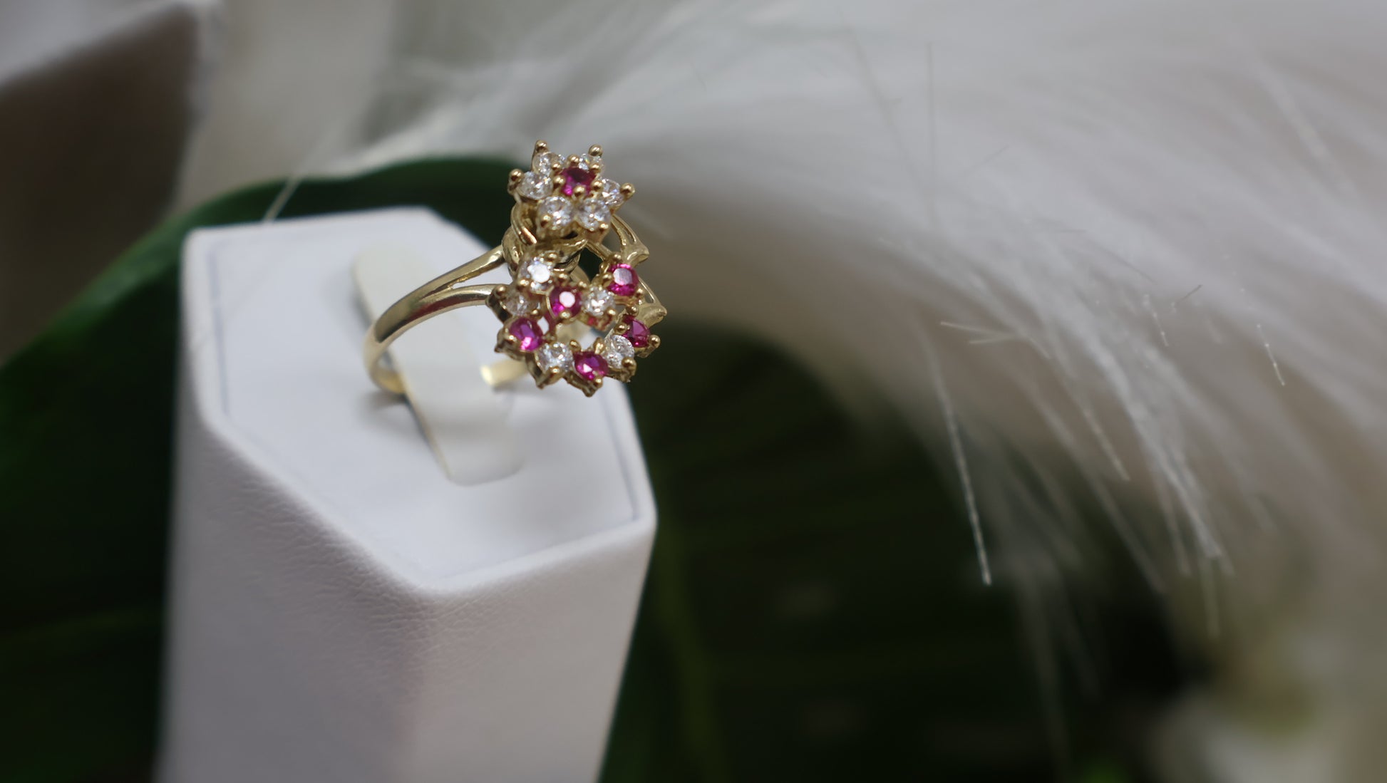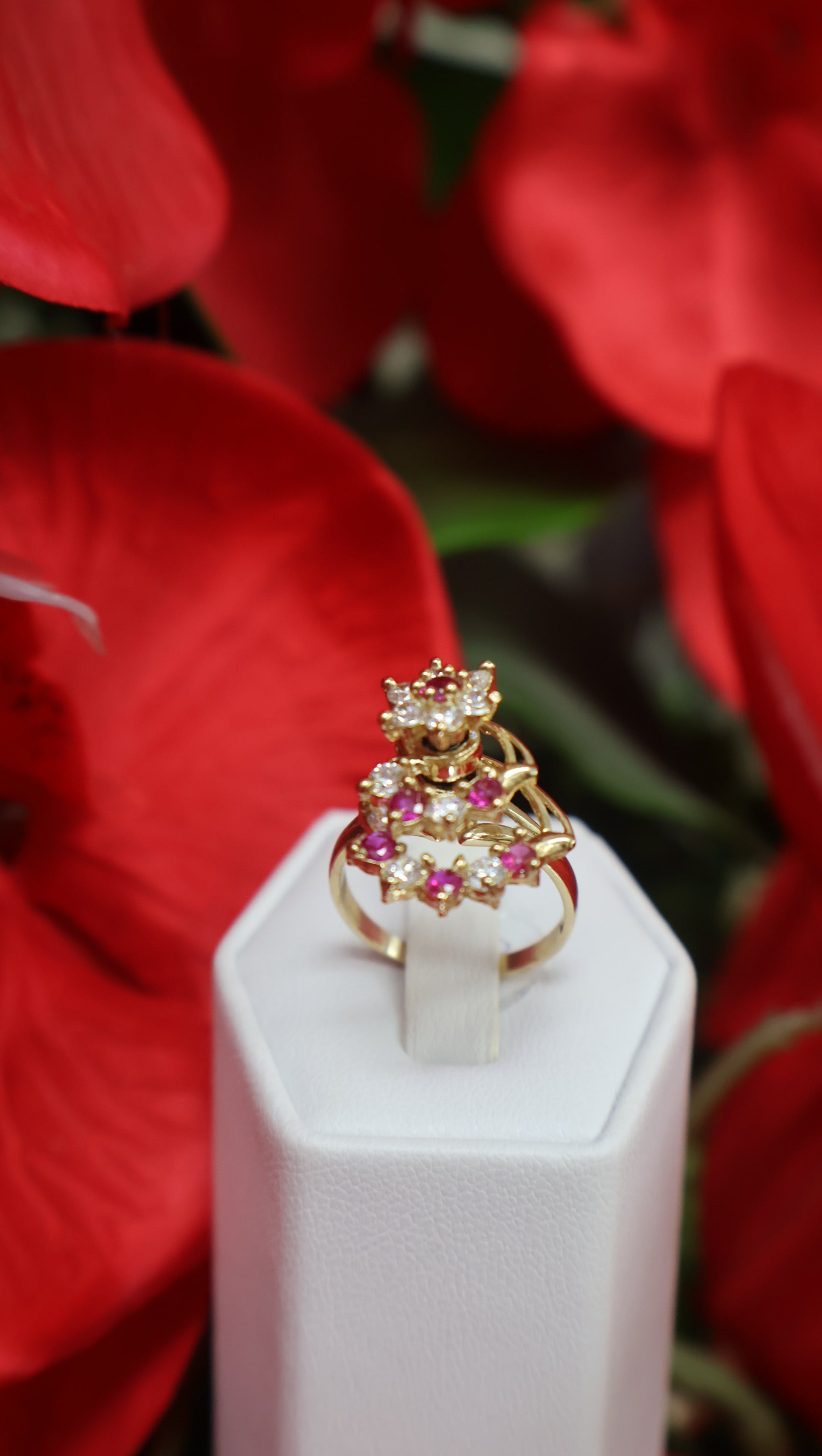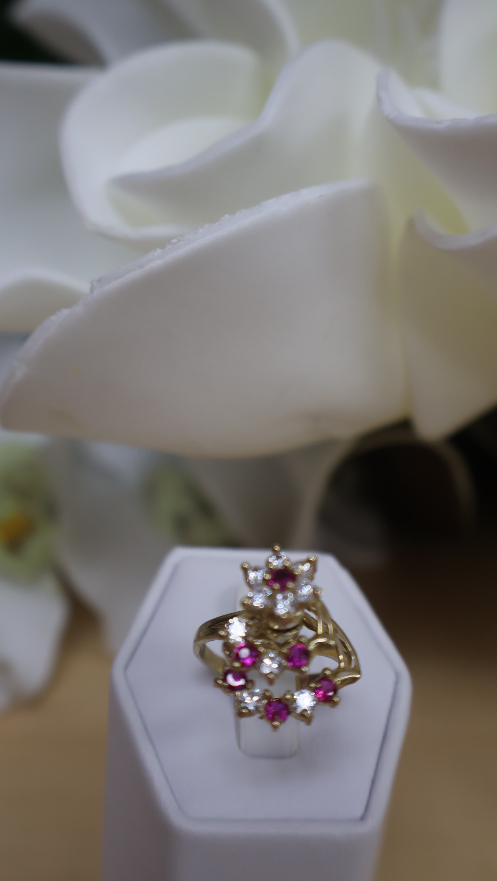 anillo de mujer giratorio con sirconia de color blanca y rosada en oro 10k