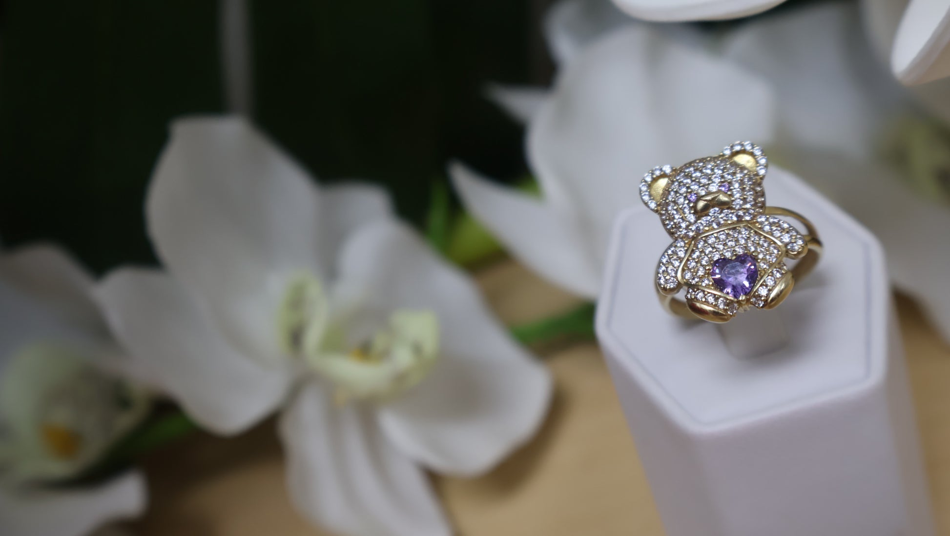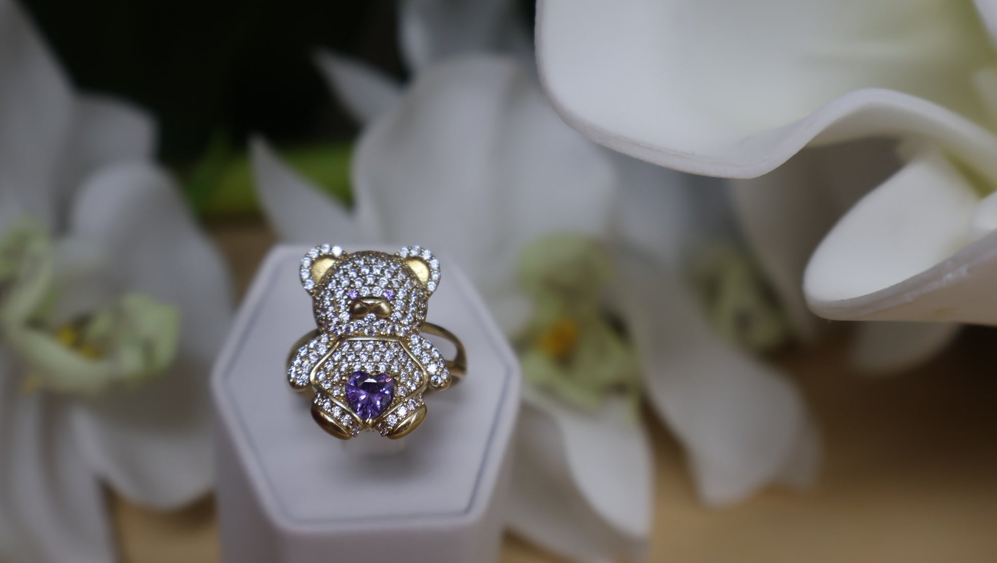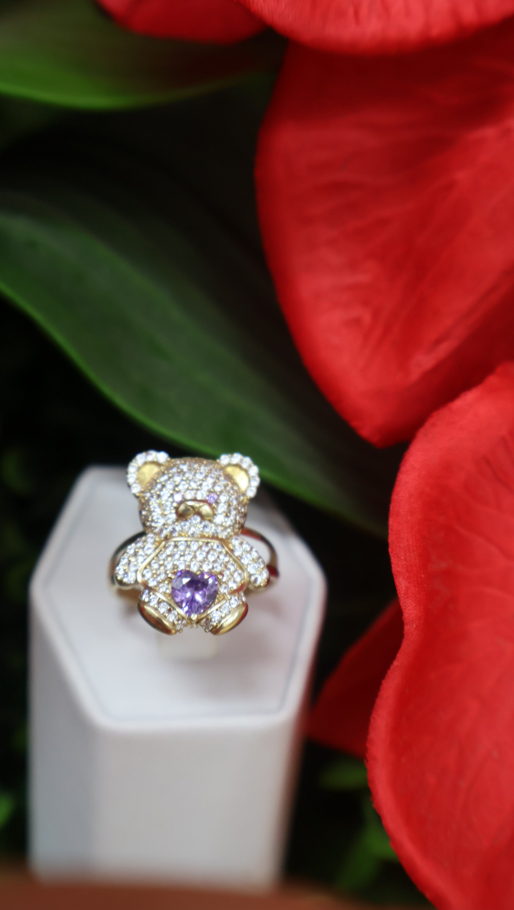 Este anillo de osito con circonia blanca y púrpura combina ternura y elegancia en una pieza única. Los brillantes tonos contrastantes realzan su diseño encantador, perfecto para quienes buscan una joya que destaque con personalidad y estilo en cualquier ocasión especial. Añade un toque divertido y sofisticado a tu colección.