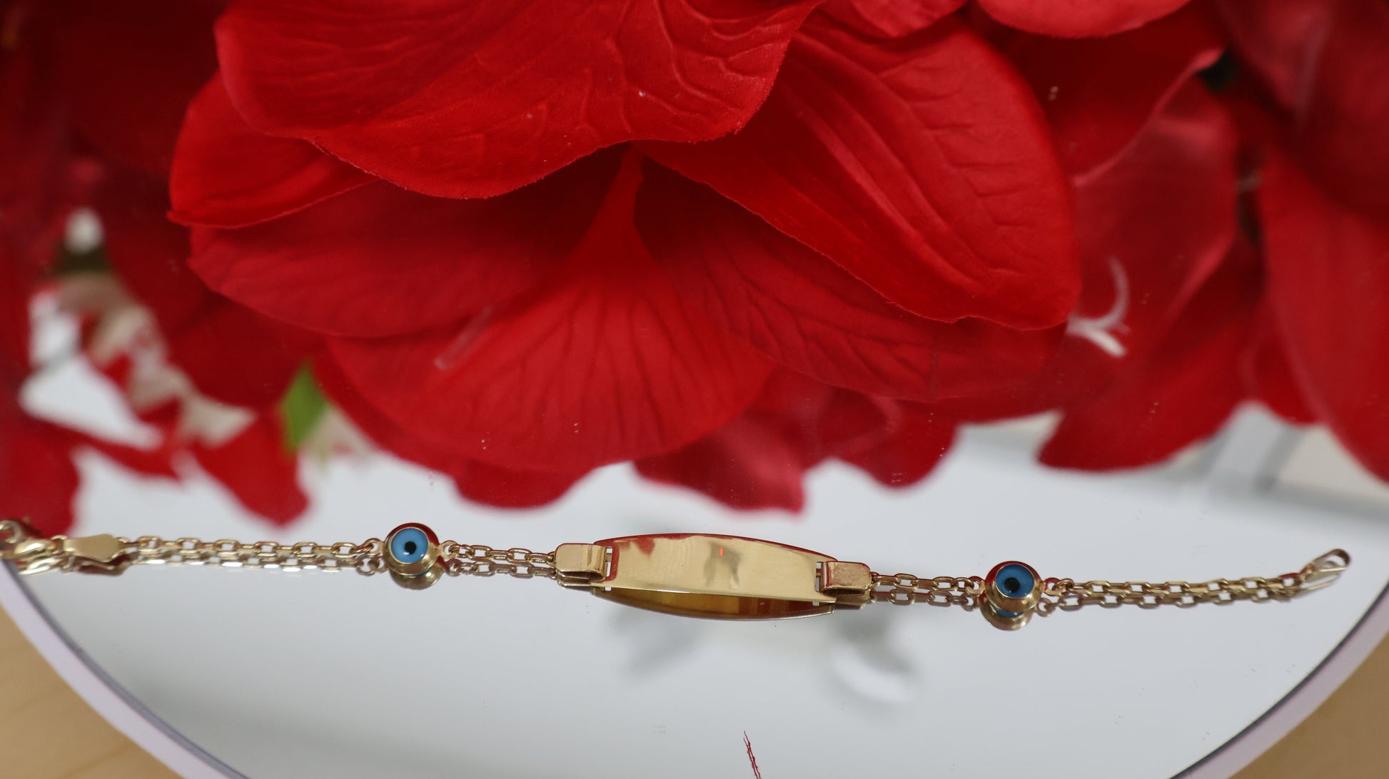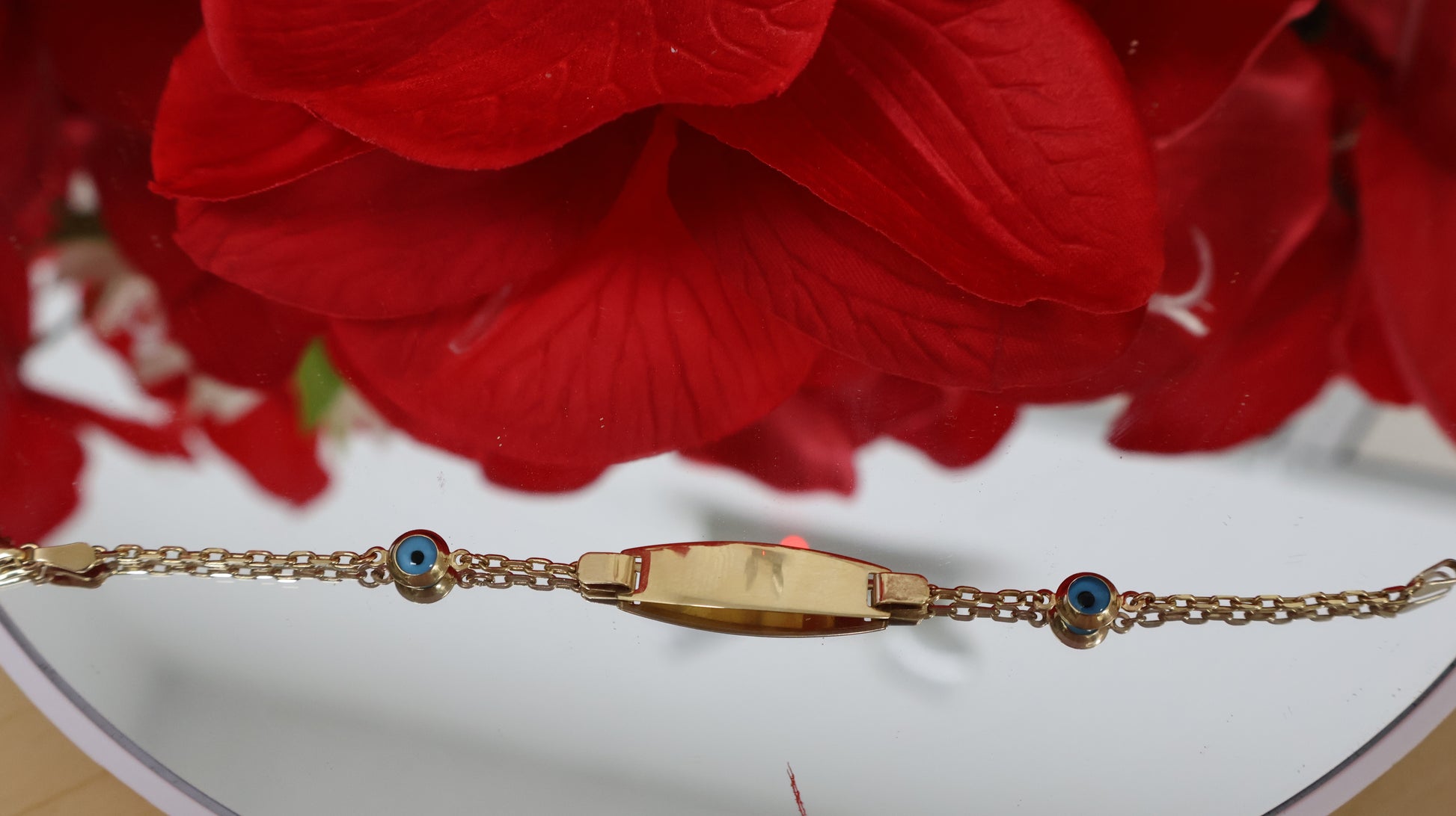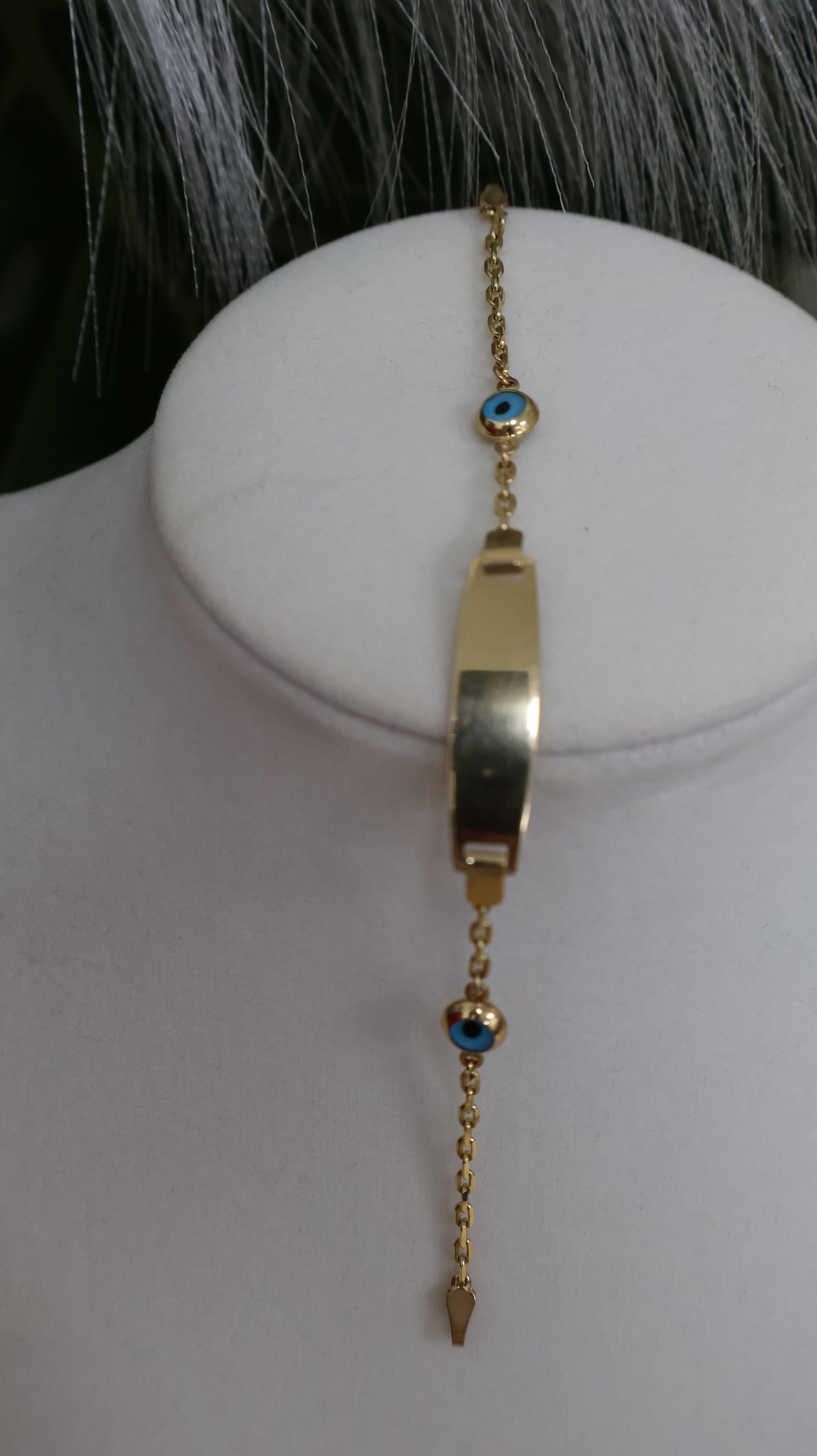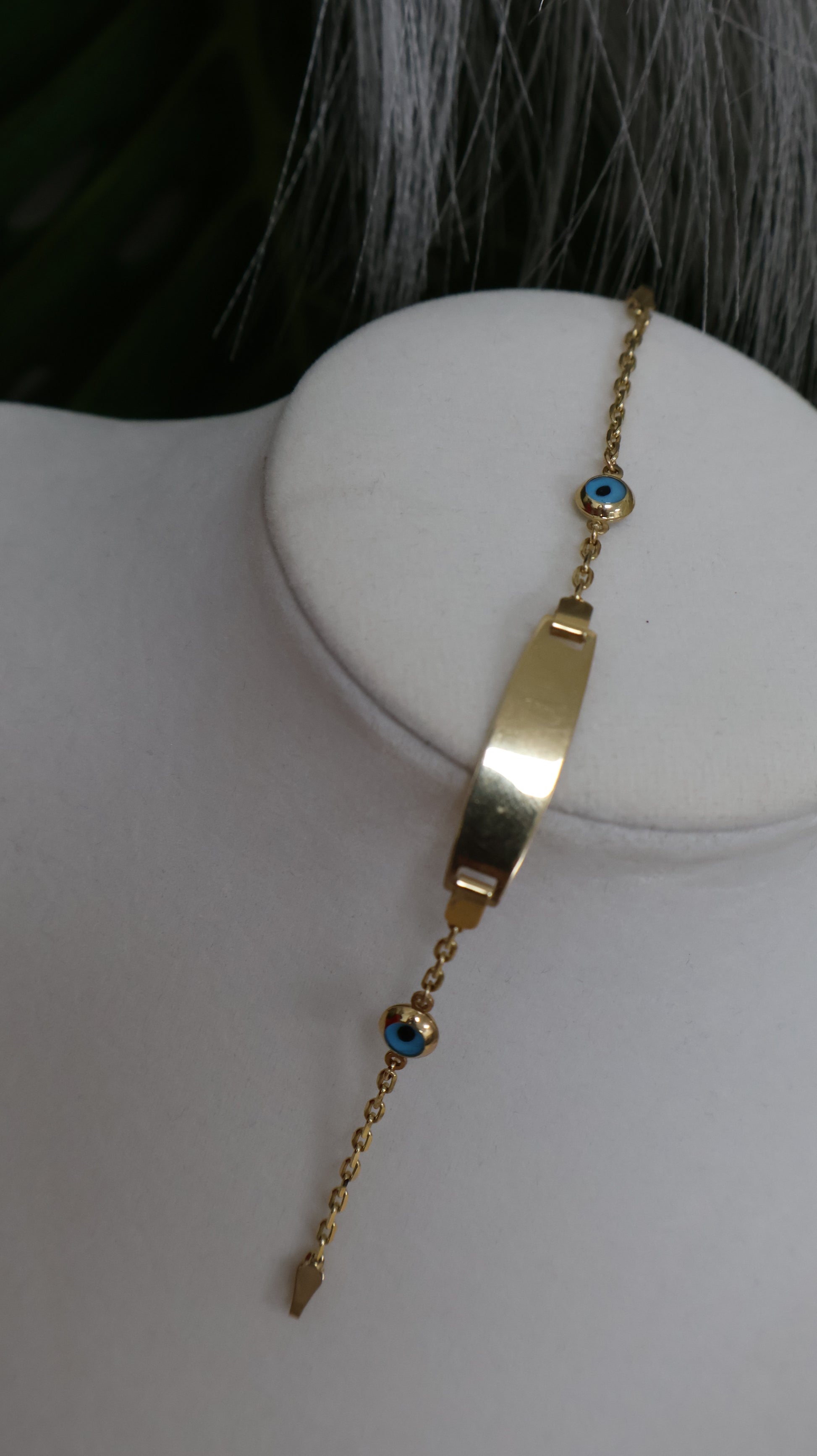 Manilla de nino con placa de ojitos en azul en oro de 14k